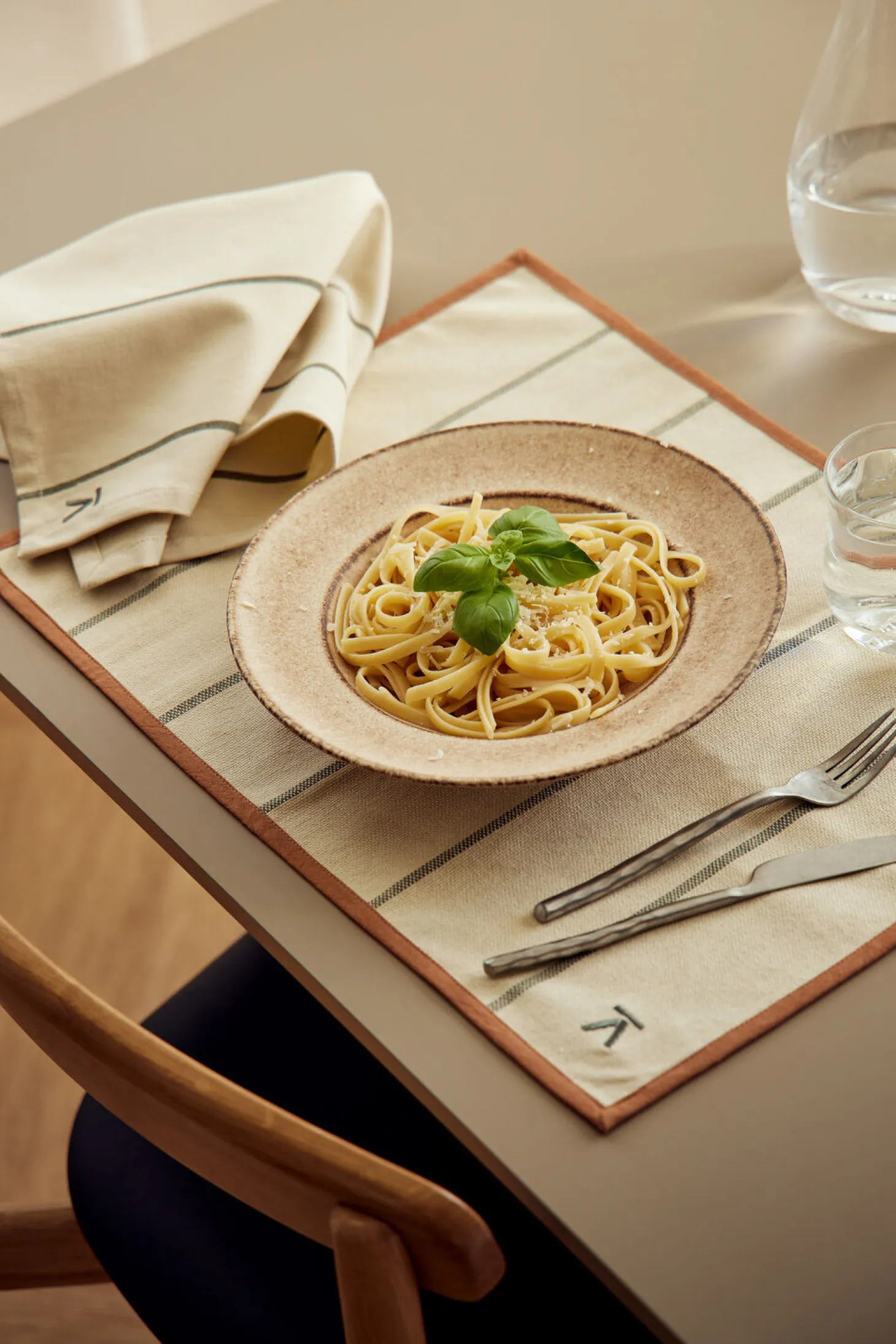 Det grønstribede mønster tilføjer en visuel detalje til dit bord uden at dominere. Hvis du ønsker at skabe en stilfuld bordopsætning, der føles gennemtænkt, passer disse servietter godt ind. De fungerer både til hverdagsbrug og når du har gæster, og logoet i hjørnet giver et diskret touch af Andersen Furniture’s tradition.