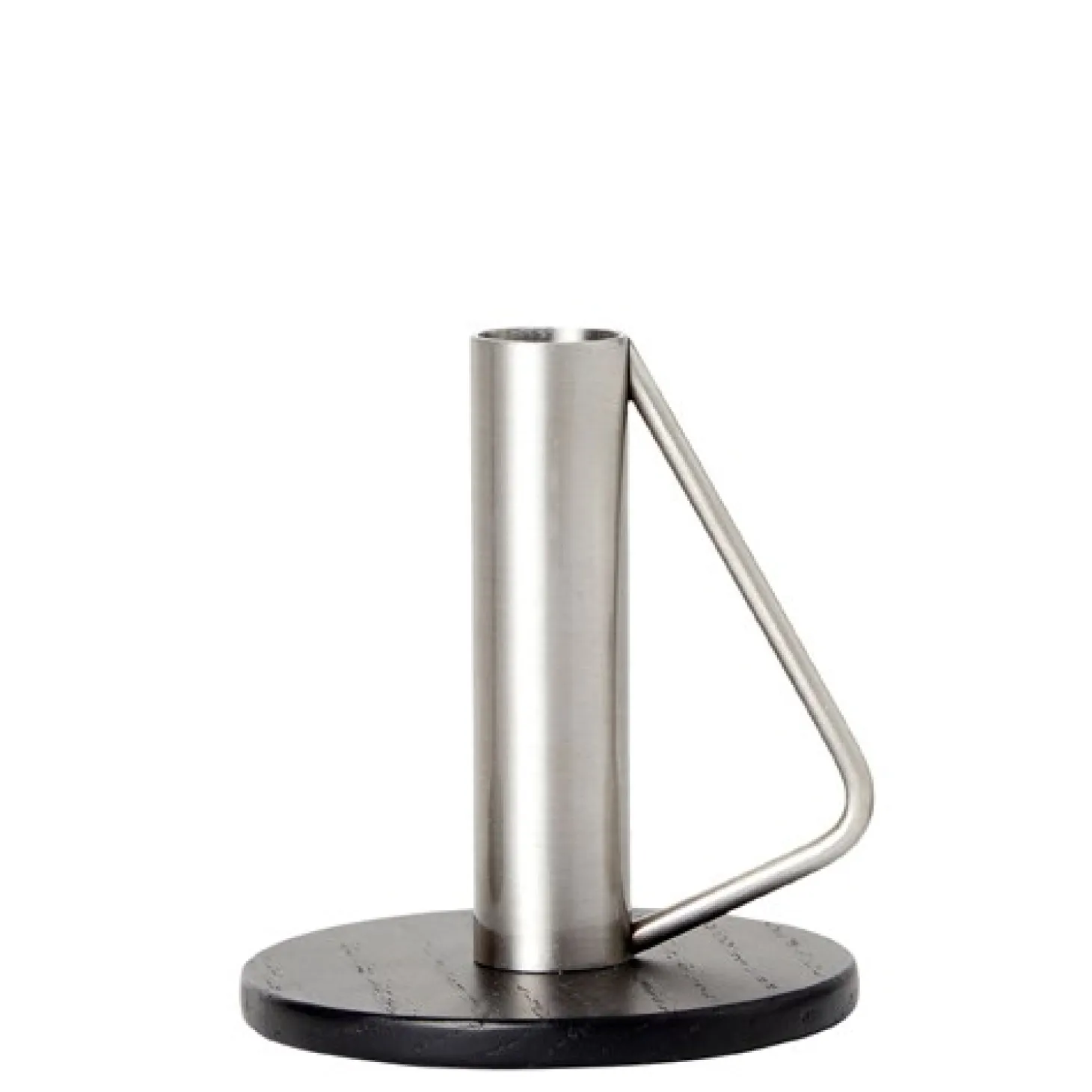 Elegant lysestage i medium fra Candleholder-serien. Smukt design i flot materialekombination, hvor lysestagens fod er i sort træ, mens selve lysestagen er i børstet stål. Serien er designet af danske Julie Damhus, der har hentet inspiration fra den gamle kirkestage.