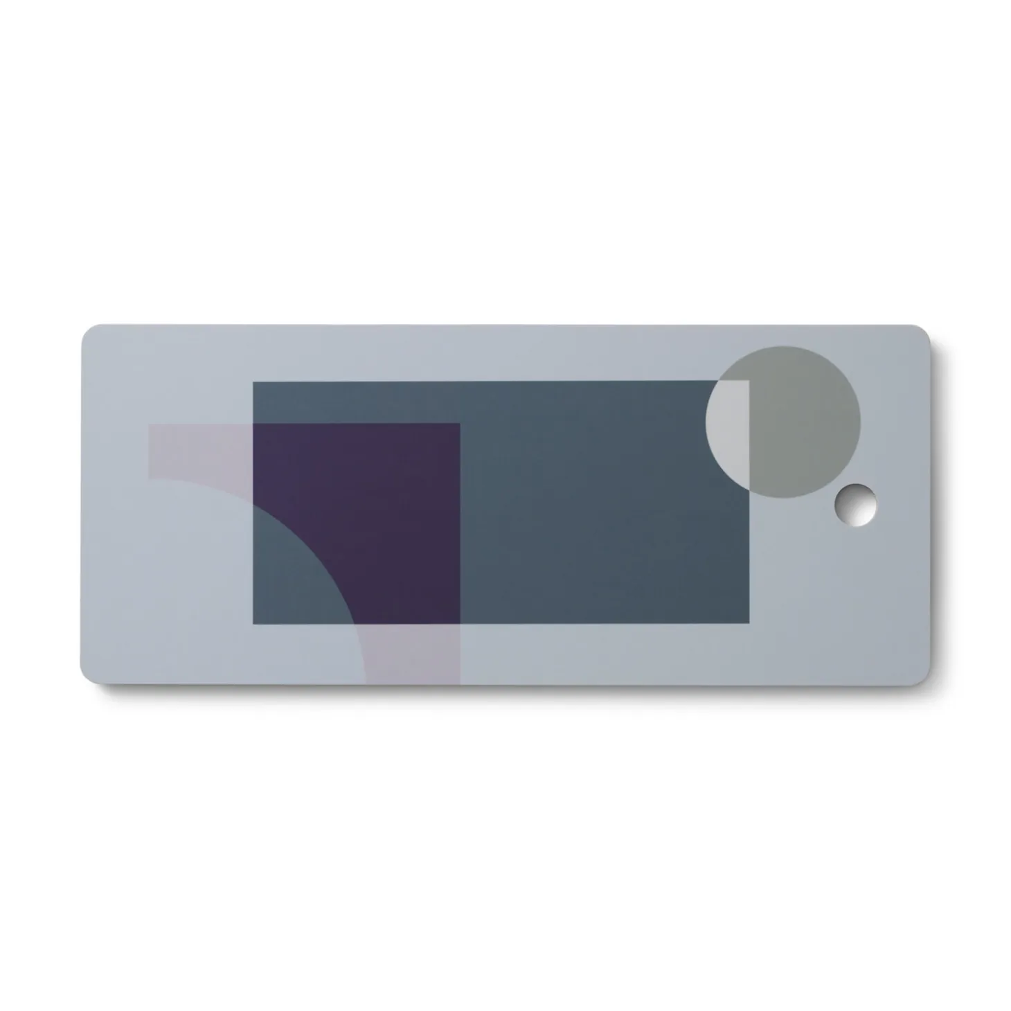 Du får et vendbart bræt med to forskellige udtryk: En side med geometrisk mønster i blå, lilla og grå nuancer og en ensfarvet grønlig bagside. Brættet har en praktisk udskæring, der gør det nemt at håndtere.