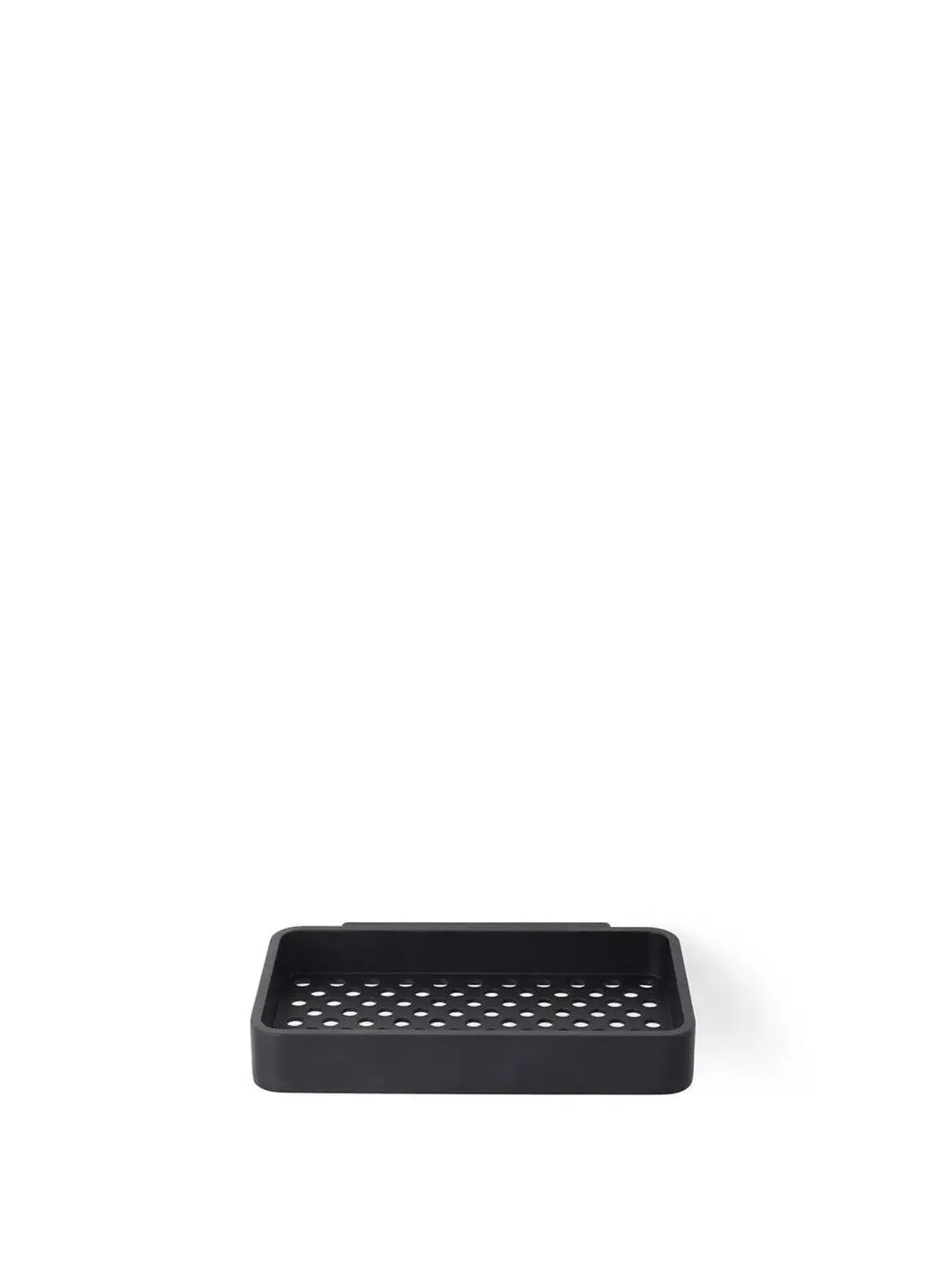 Superfin bakke til badet fra Audo. Denne bakke er en rigtig god løsning, når det kommer til opbevaring af sæbe, barberblade og andre badeværelsesprodukter. Designet er enkelt og moderne, hvilket appellerer til en minimalistisk æstetik. Den sorte bakke har en glat overflade og en række små huller i den øverste del, som gør den praktisk til badeværelset.