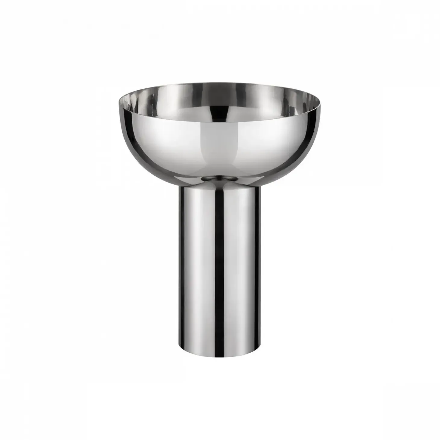 Med mål på 21 cm i højden og 17 cm i diameter passer vasen både på smalle hylder og bredere borde. Den cylindriske base giver stabilitet, mens den brede top giver plads til forskellige buketter. Det polerede stål fungerer som en neutral base, der tilpasser sig skiftende blomster og årstider uden at dominere rummet.
