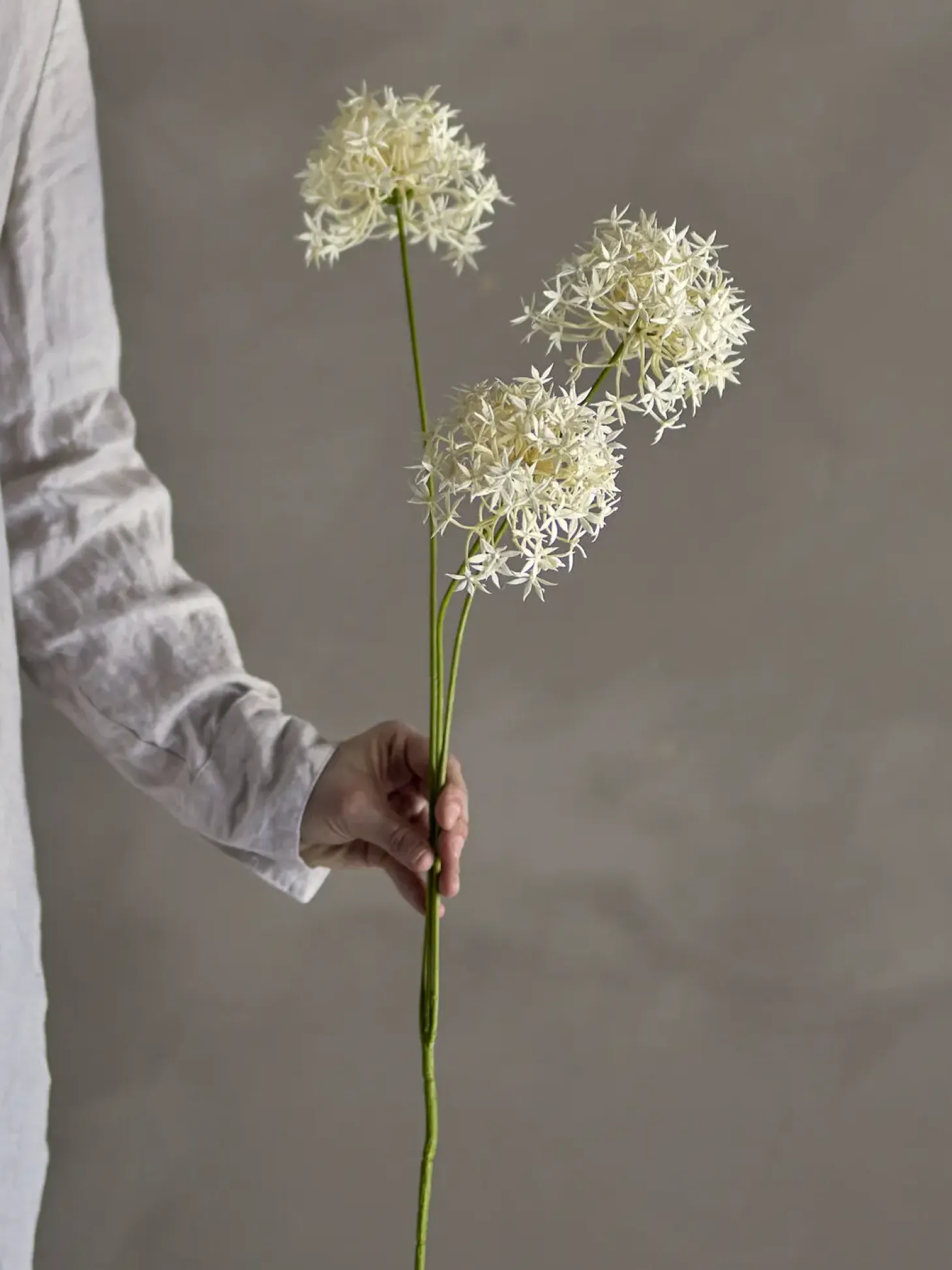 Før du placerer stilken i din foretrukne vase eller arrangement, kan du trimme og folde den efter behov. De hvide blomsterhoveder og grønne stilke skaber en naturlig kontrast, der nemt kan integreres i forskellige indretningsstile.