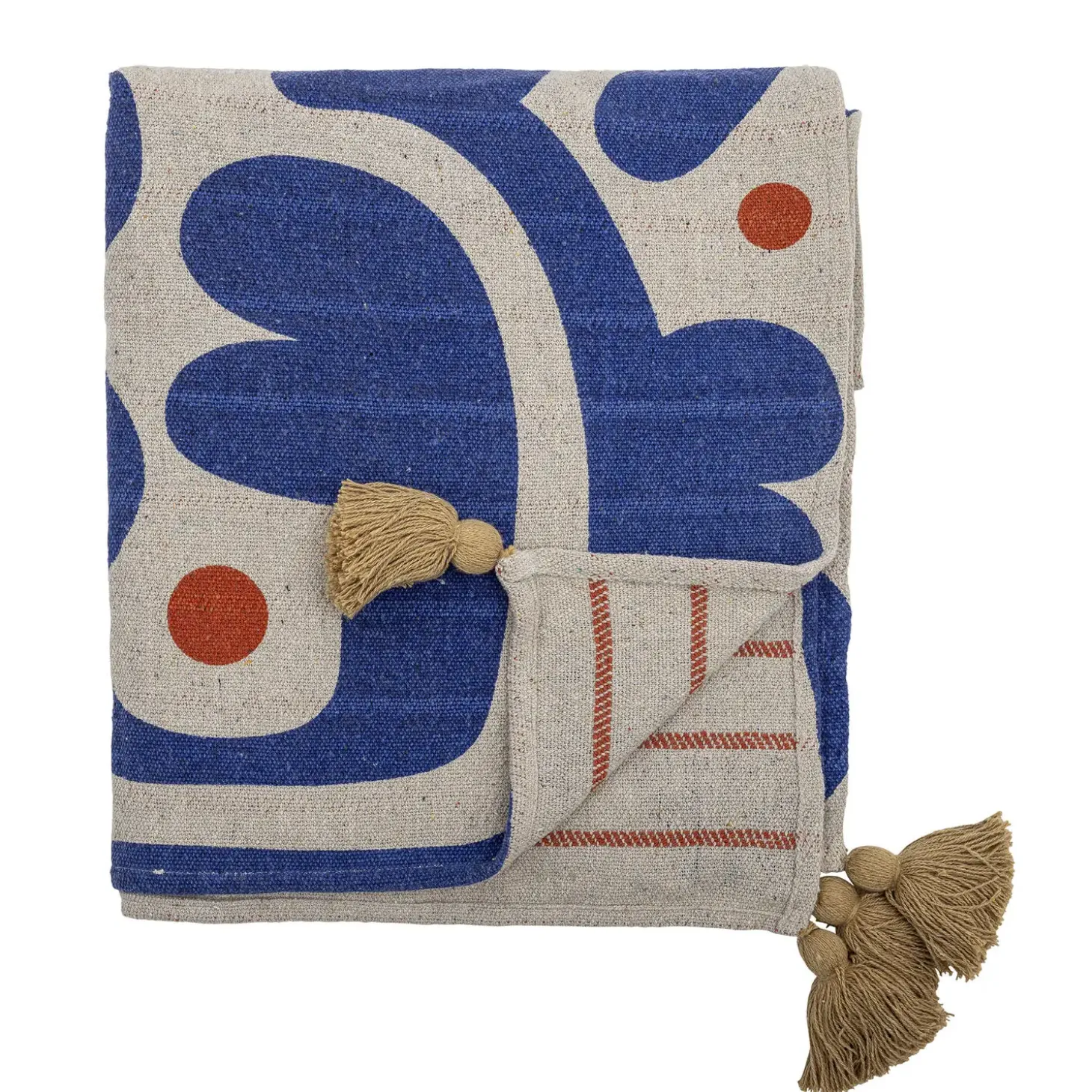 Dette genanvendte bomuldsplaid har et mønster i blå og røde toner med en vævet finish. Bagsiden har vævede røde striber, hvilket giver dig to forskellige udtryk at vælge imellem. Plaidet er designet til at tilføje komfort og variation til dit hjem.