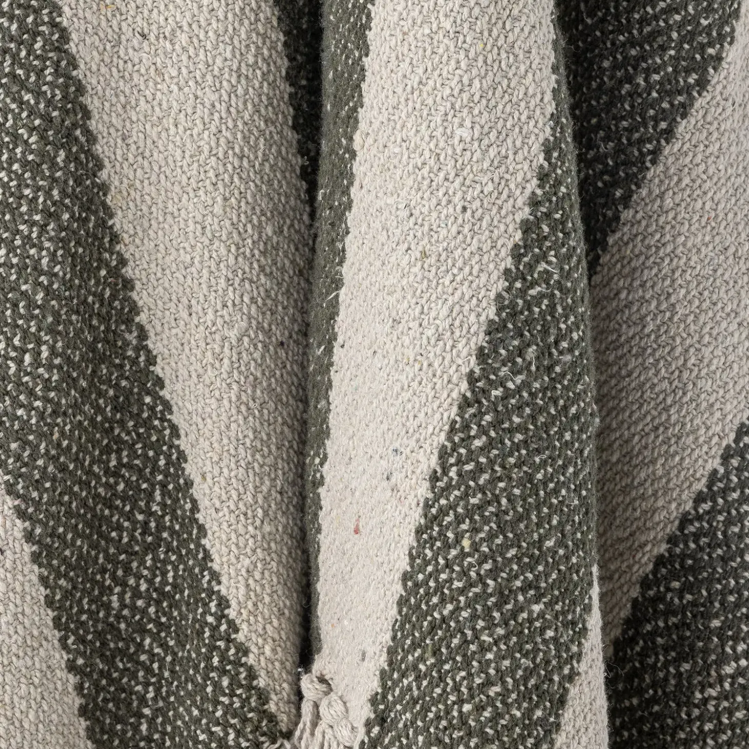 Den vævede finish giver plaiden en særlig fornemmelse, mens stribemønstret i grøn og hvid skaber et roligt udtryk. Tørretumbling ved lav varme er muligt, hvilket gør den daglige pleje nem. Frynserne i begge ender fuldender designet.