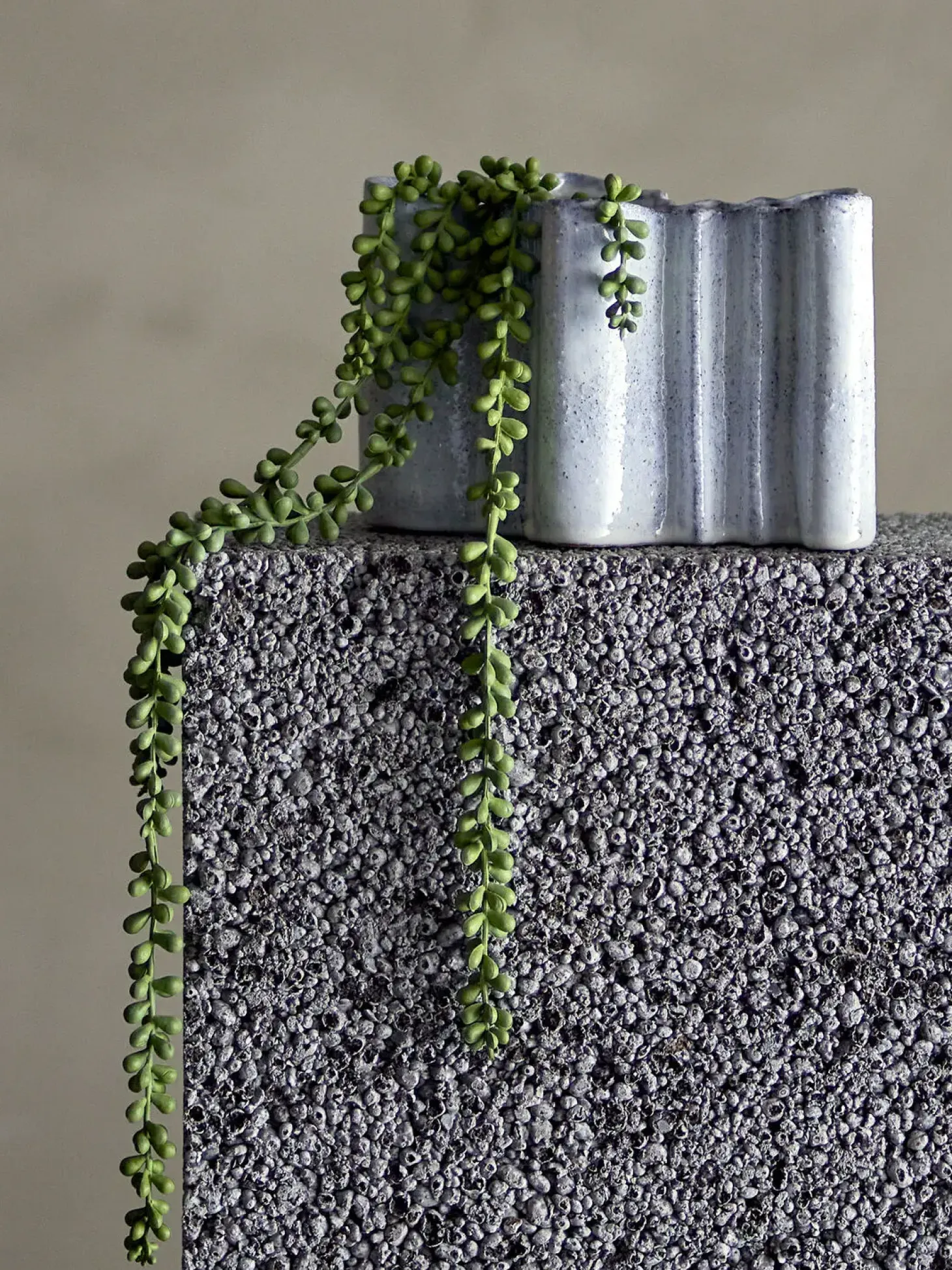 Den bølgende form skaber interessante skygger og dybde i dit rum. Stentøjets robuste egenskaber sikrer, at vasen forbliver smuk gennem daglig brug, mens den matte overflade giver et sofistikeret udtryk.