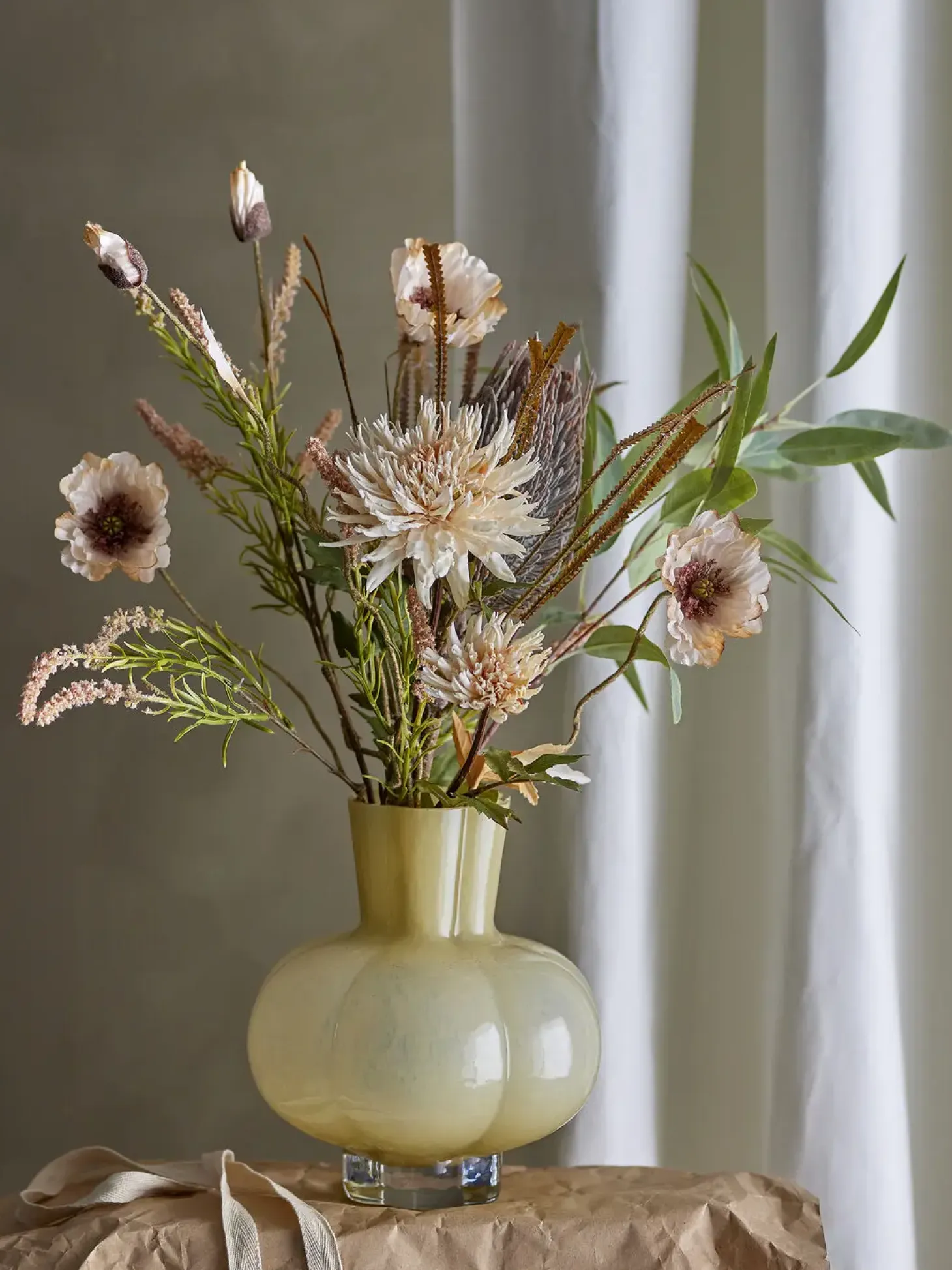 Denne kunstige valmue fra Bloomingville byder på flere blomsterhoveder og knopper på samme stilk, hvilket skaber en fyldig og naturlig dekoration. De let bølgede stilke og de lyse blomster med mørkere center giver et autentisk udtryk.