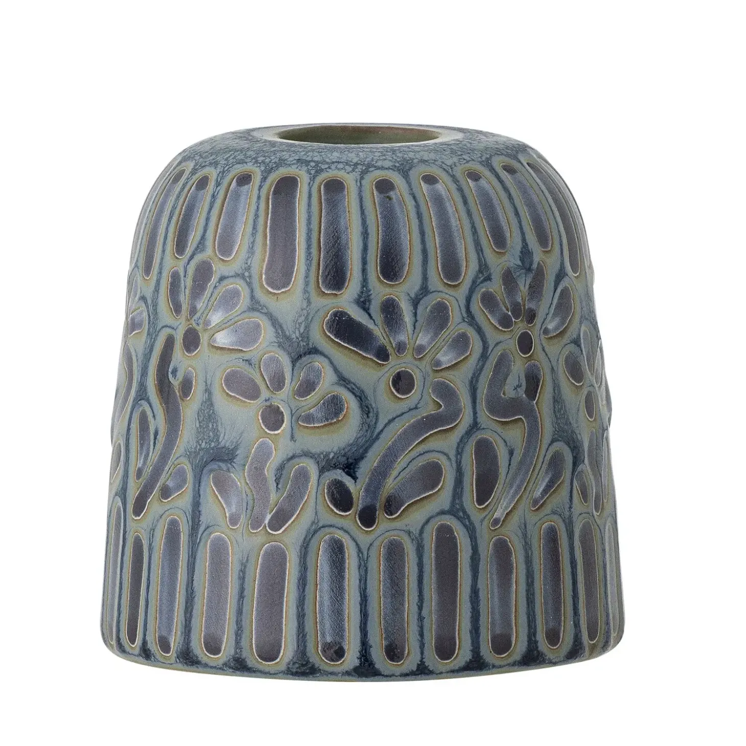 Denne håndlavede lysestage i blå stentøj bringer kunstnerisk karakter til dit hjem. Den reaktive glasur skaber et præget blomstermønster, der gør hver lysestage særpræget. Stentøjets robuste egenskaber sikrer lang holdbarhed.