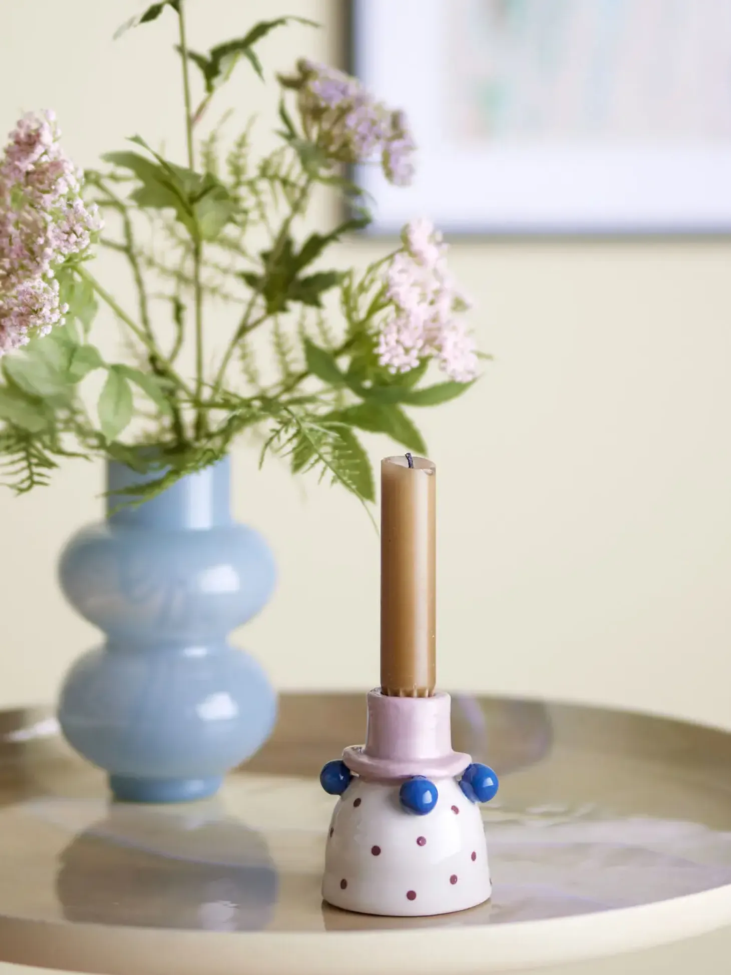 Med sine kompakte mål passer lysestagen på spisebordet, vindueskarmen eller hylden. Den rosa og blå glasur skaber et friskt udtryk, der kan kombineres med forskellige indretningsstile. Lysestagen er både funktionel og dekorativ.