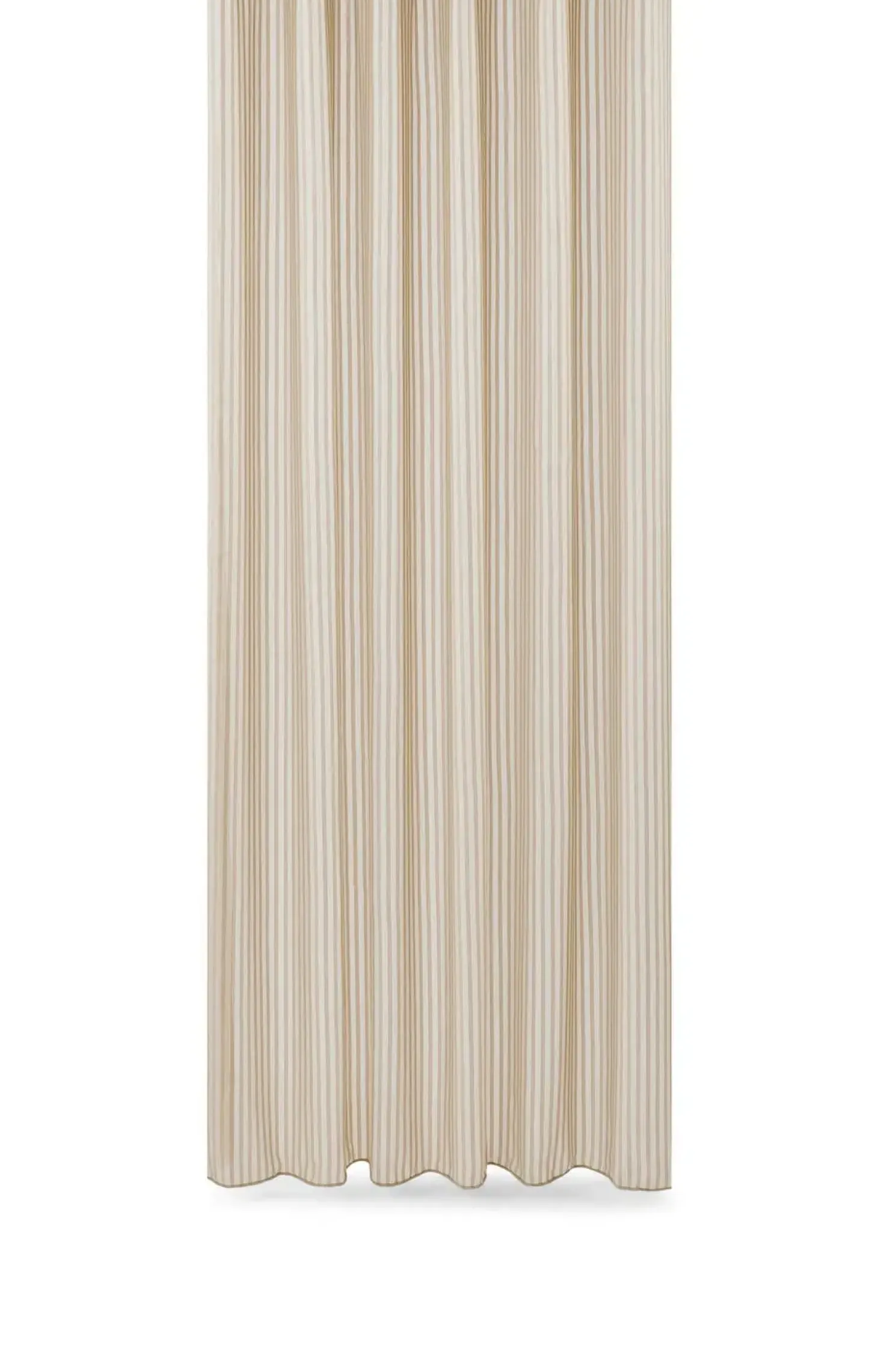 Dette badeforhæng på 140 x 220 cm passer til standardbadeværelser og giver god dækning. De vævede striber i beige og hvid skaber et roligt udtryk, mens rynkebåndet sikrer en jævn ophængning.