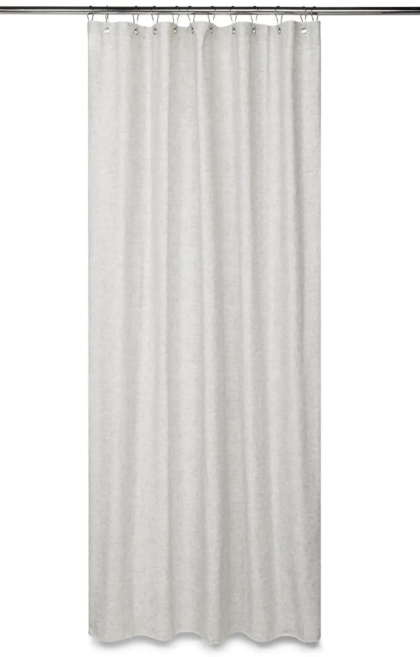 Det grå hør-look giver dit badeværelse et roligt og tidløst udtryk. De 12 påmonterede ringe gør det nemt at hænge forhænget op, og den generøse bredde sikrer, at vandet bliver, hvor det skal være. Husk at købe kroge til ophængning separat.