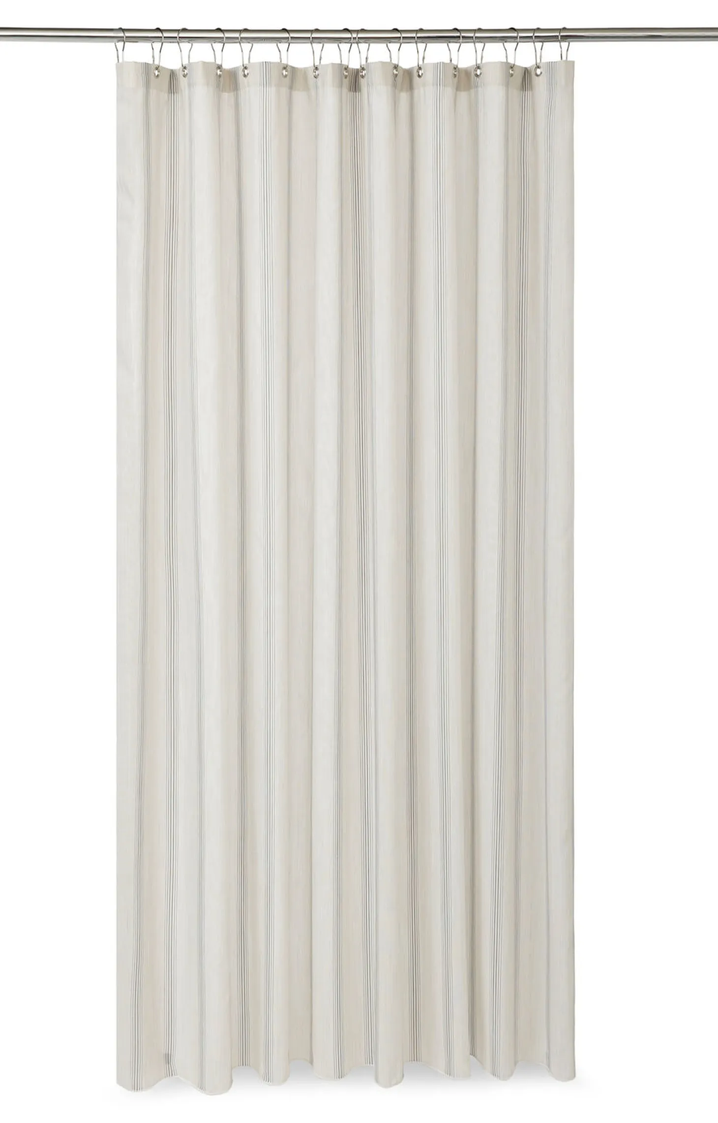 Dette badeforhæng i sandfarvet stof med vævede striber i grå og hvid skaber en lys og luftig stemning i badeværelset. Den semi-transparente kvalitet giver et behageligt lysindfald, mens du stadig bevarer dit privatliv.