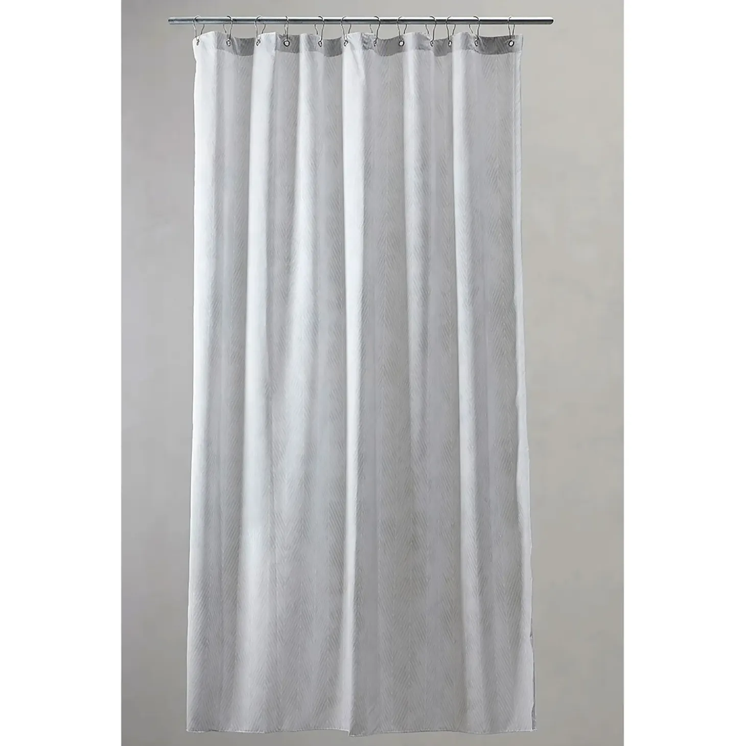Det trykte sildebensmønster med vandeffekt tilfører et diskret designelement til dit badeværelse. Den lyse grå nuance harmonerer med forskellige indretningsstile, mens det antibakterielle materiale holder forhænget friskt i længere tid.
