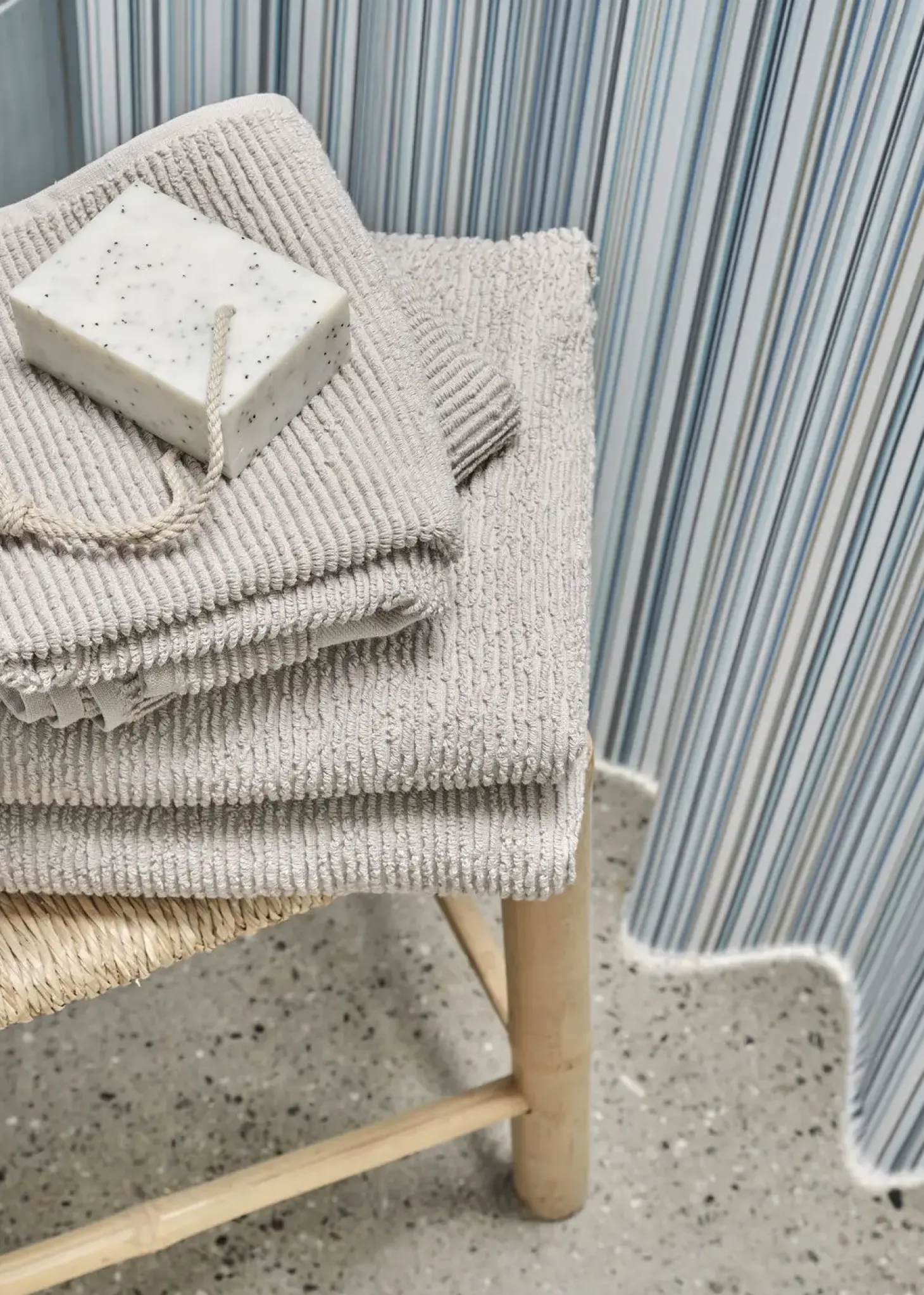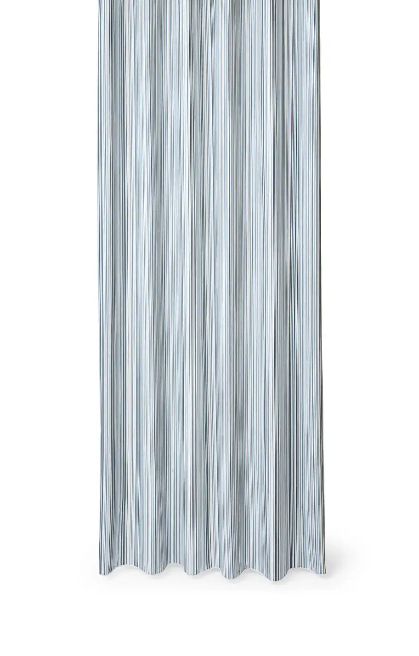 De smalle striber i blå nuancer skaber et roligt udtryk i dit badeværelse. Rynkebåndet sikrer, at forhænget falder naturligt og giver en ensartet fordeling, når du hænger det op. Du får både et dekorativt og praktisk badeforhæng.