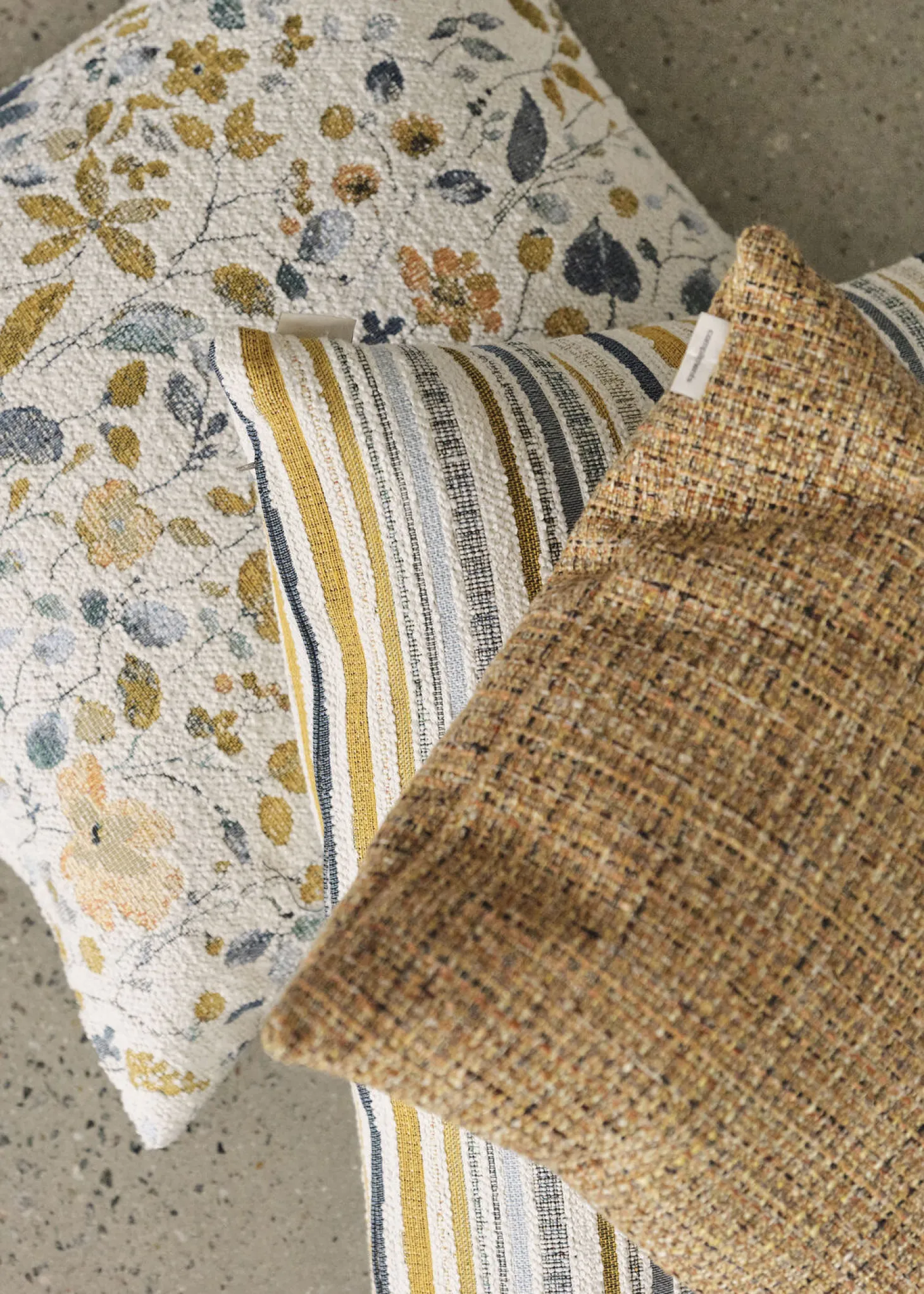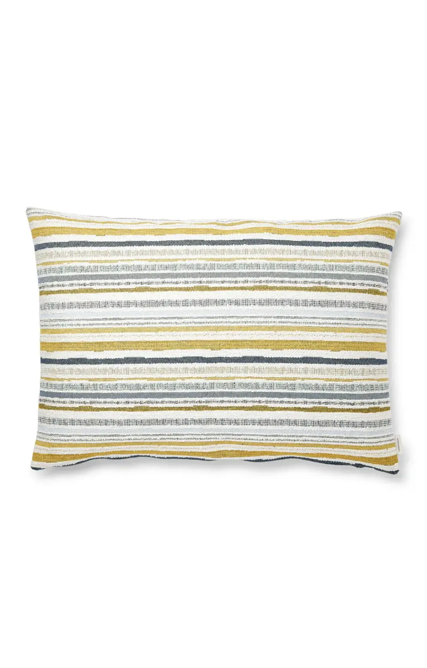 En særlig terry-struktur mod den gennemgående jacquard-vævede strib giver den tidløse Solace pude et hyggeligt udtryk, som står smukt mod det fine farvespil i solens og havets nuancer.