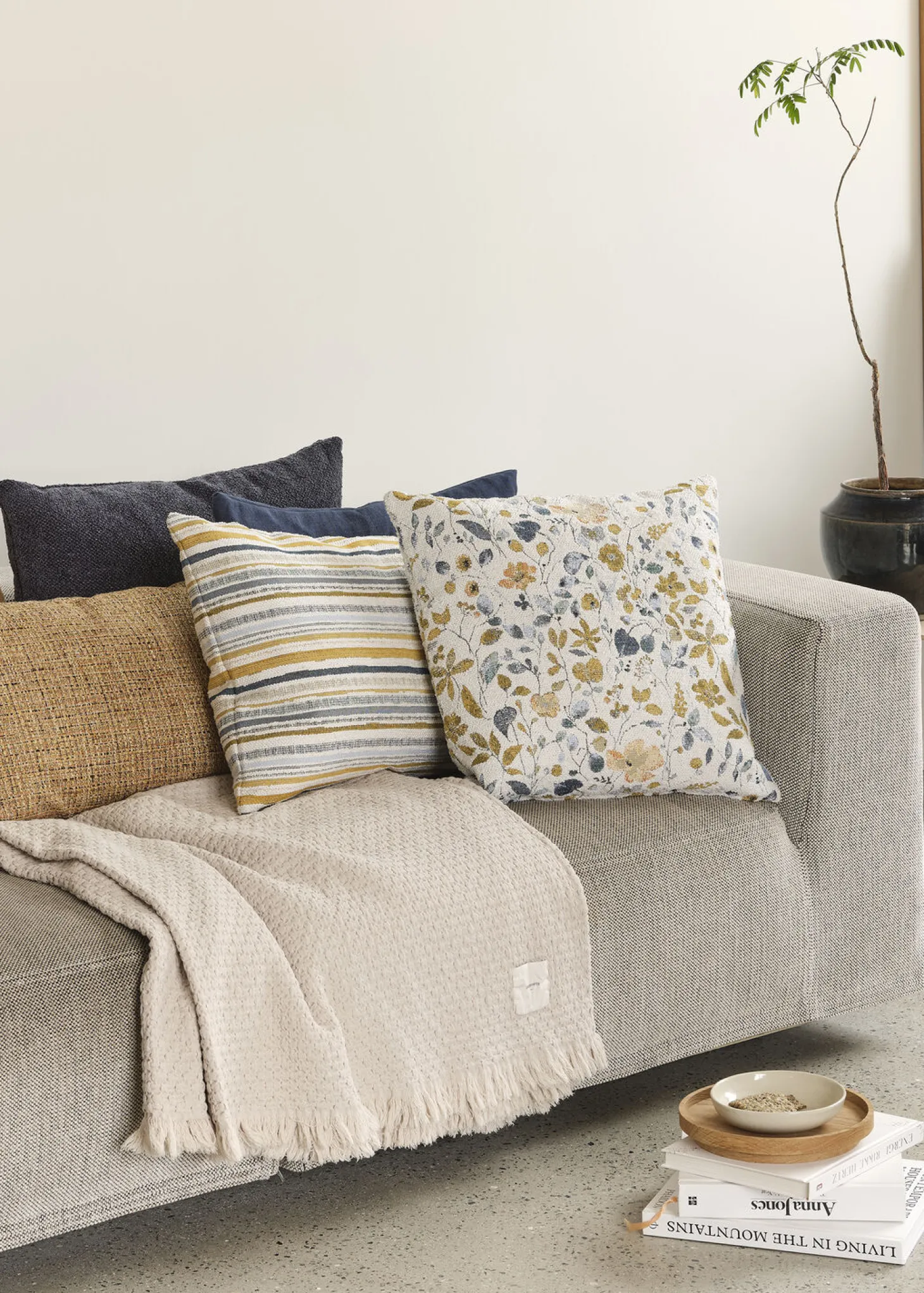En særlig terry-struktur mod den gennemgående jacquard-vævede strib giver den tidløse Solace pude et hyggeligt udtryk, som står smukt mod det fine farvespil i solens og havets nuancer.