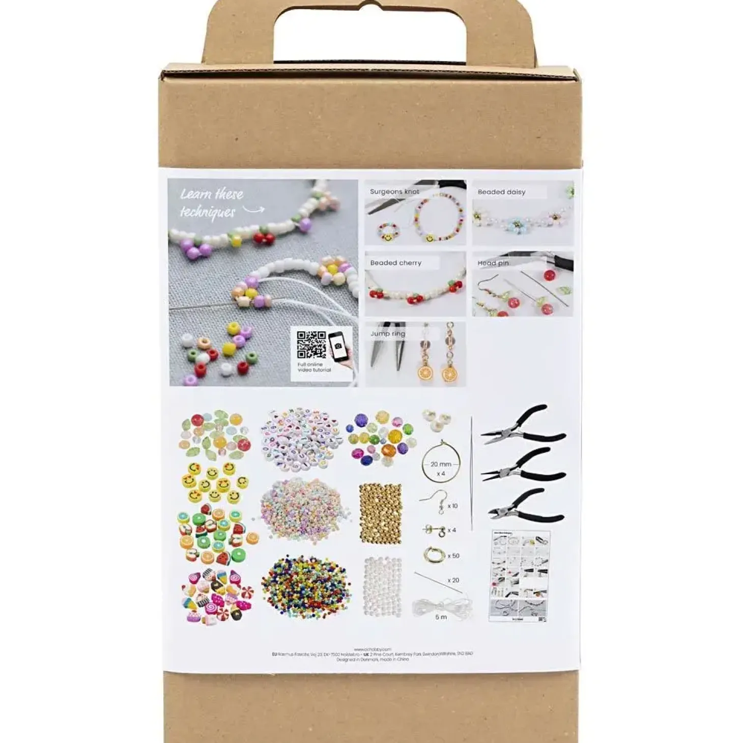 Med dette kit fra Creativ Company kan du lære at lave smykker. Indeholder alle de materialer du skal bruge, og al den vejledning du behøver. Vil du lære at lave dine egne smykker, er dette Start DIY Kit helt perfekt. Det indeholder alt, hvad du skal bruge for at komme godt i gang. Scan QR-koden, og bliv ført ind i vores læringsunivers fyldt med videoer, som er klar til at guide dig. Du vil lære forskellige basiselementer og teknikker indenfor smykkefremstilling, og til sidst vil du stå med fire par øreringe, 20-25 perlearmbånd, fingerringe eller halskæder på elastiksnor.