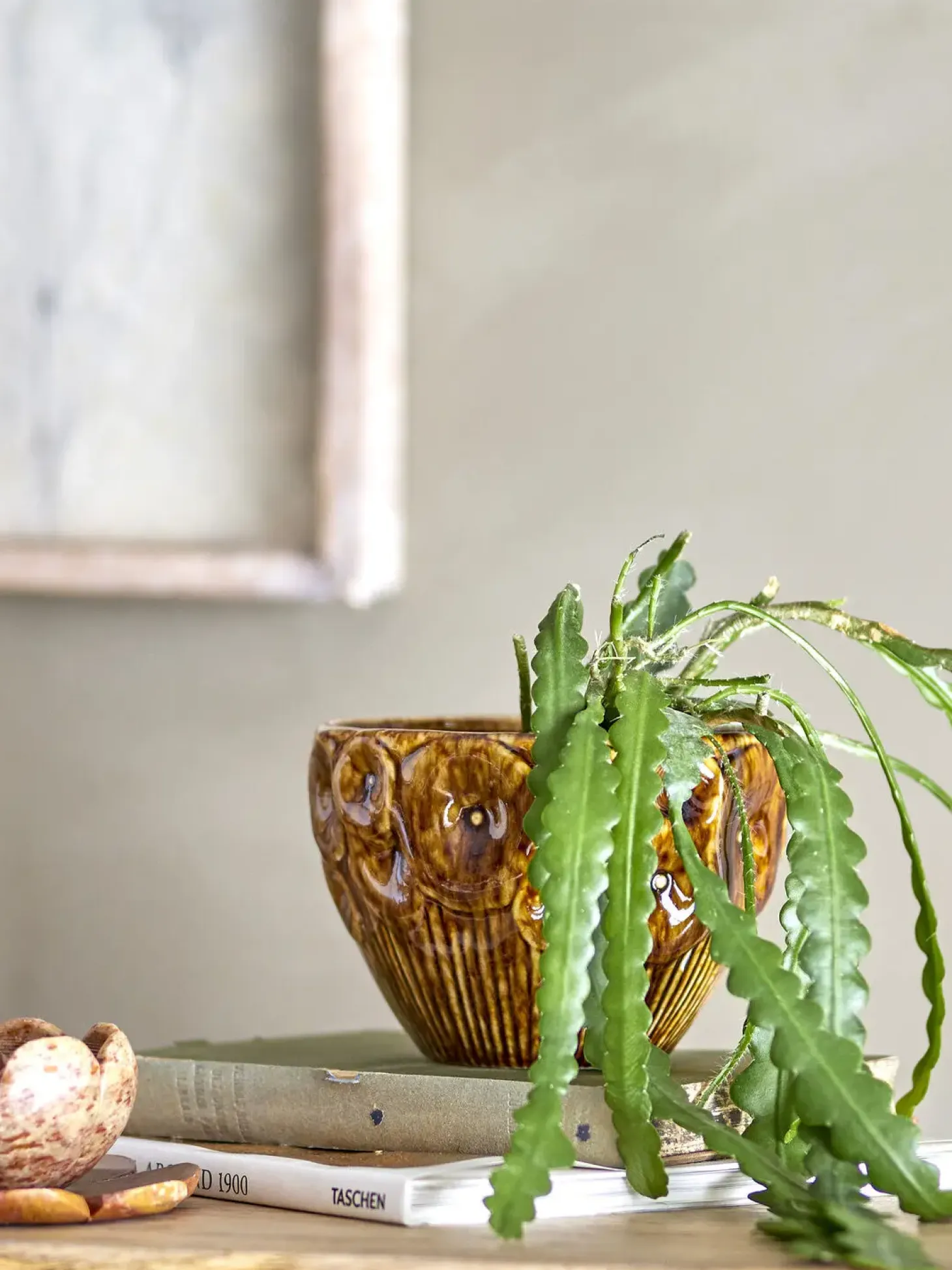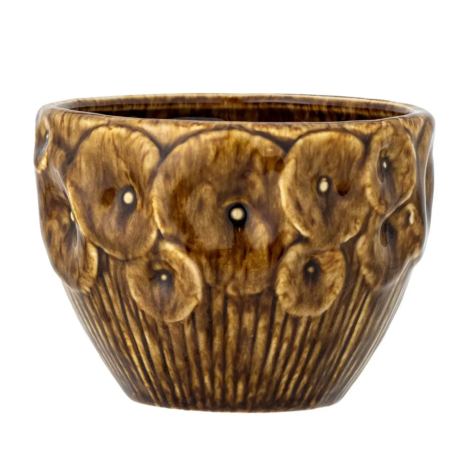 Rokaya Urtepotteskjuler er designet med et tekstureret blomstermønster på ydersiden, som er en integreret del af dens æstetiske udtryk. Den brune glasur giver hver potte et særpræg med naturlige farvevariationer, hvilket understreger det håndlavede aspekt. Denne unikke finish gør hver enkelt potteskjuler til et lille kunstværk i sig selv, perfekt til at fremhæve dine planters naturlige skønhed.