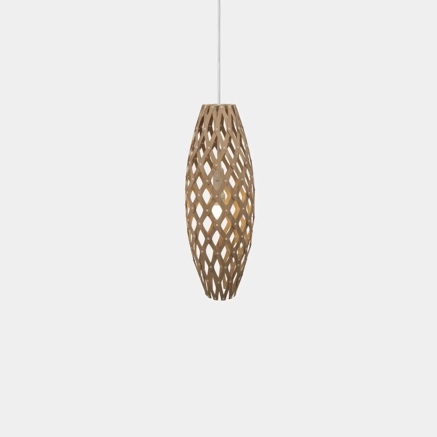 Super smuk og anderledes lampe fra David Trubridge. Navnet på den aflange pendel, Hinaki, betyder ruse, fordi den har samme proportioner som en gammeldags ruse, man fanger fisk med.
