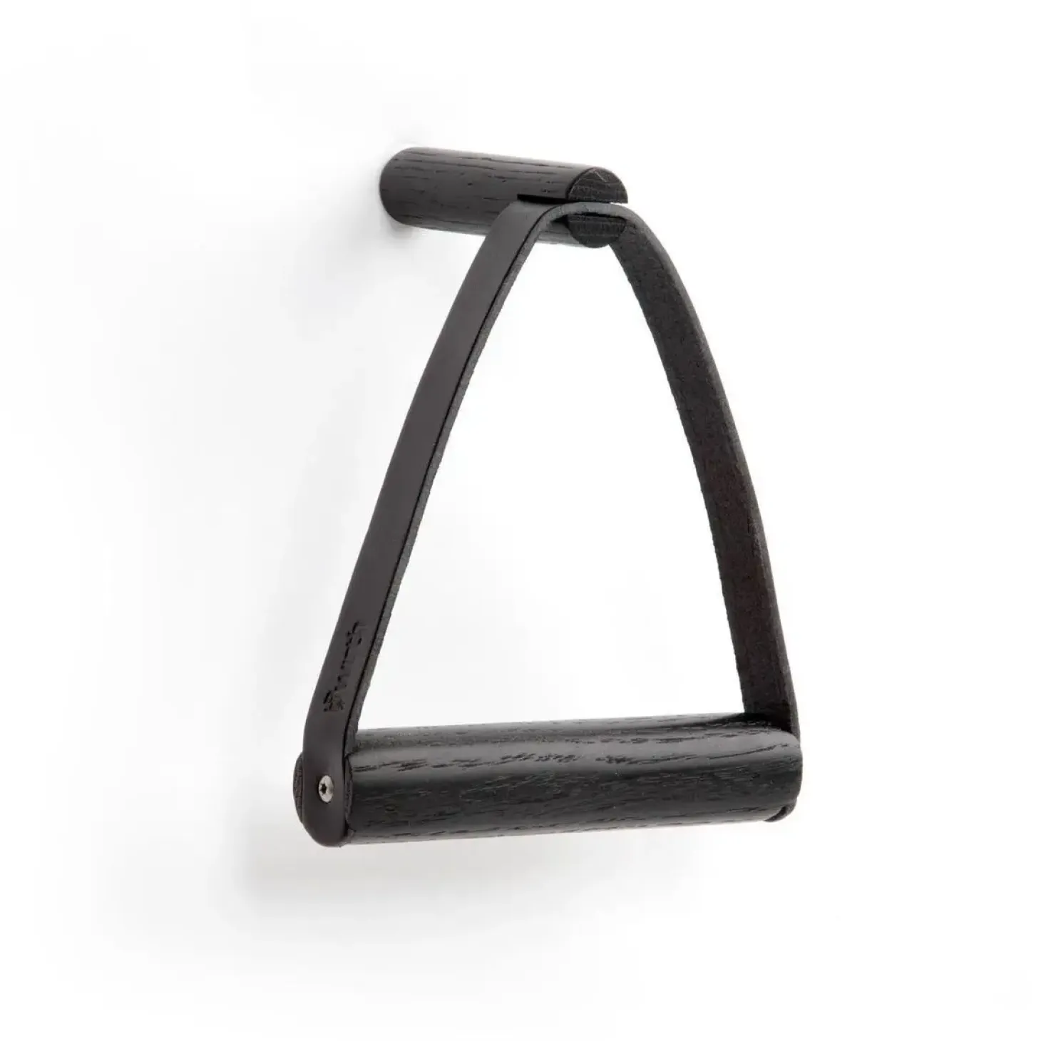 Denne toiletrulleholder kombinerer egetræ og sort læder i et design, der tilføjer karakter til dit badeværelse. Materialevalget giver både holdbarhed og en naturlig æstetik, der passer ind i moderne hjem. Den trekantede form med vandret stang holder en standard toiletrulle sikkert på plads.