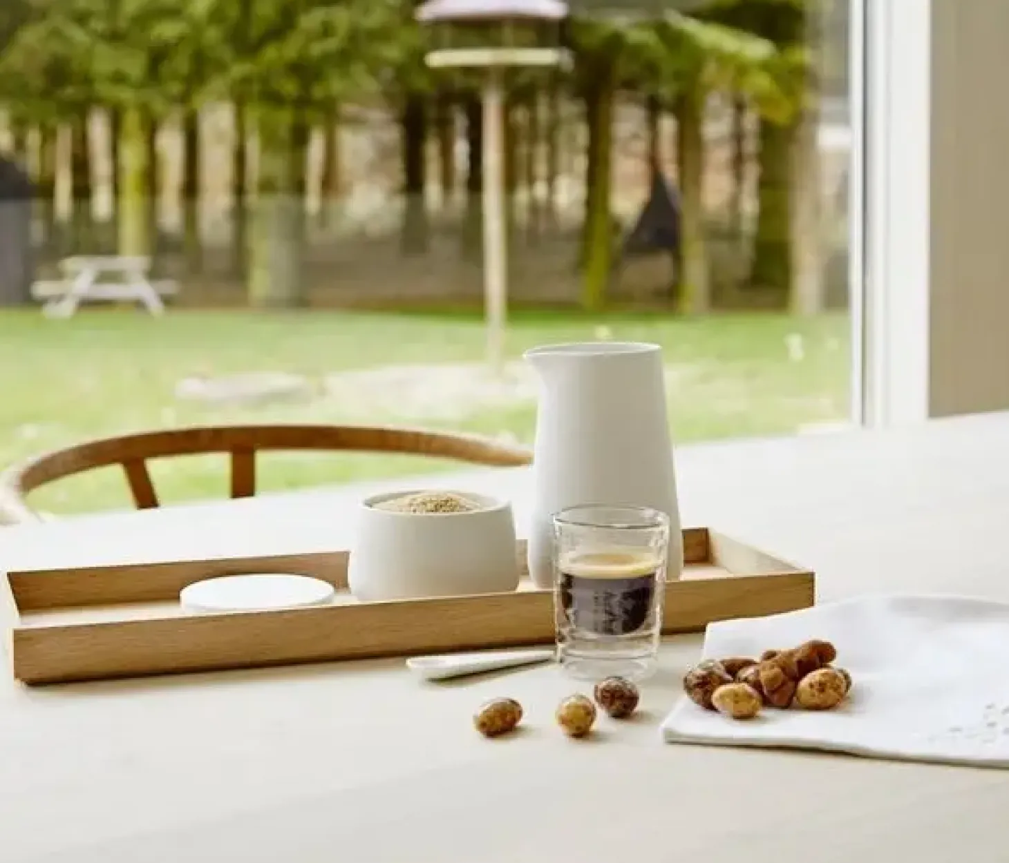 Denne bakke fra Fritz Hansen kombinerer holdbar eg med naturlig skønhed. Den måler 42 cm i bredden og 14 cm i dybden, hvilket giver plads til både kopper, skåle og små genstande. Højden på 3 cm med hævede kanter holder tingene sikkert på plads.