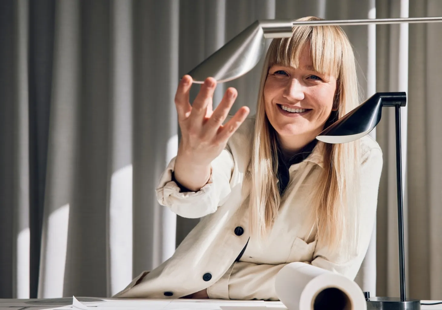 MS022-bordlampen fra Fritz Hansen er designet af Mette Schelde. Denne moderne lampe kombinerer æstetik, holdbarhed og funktionalitet i et strømlinet design. Lampen er udstyret med en indbygget dæmpefunktion, som gør det nemt at justere lysstyrken efter behov.