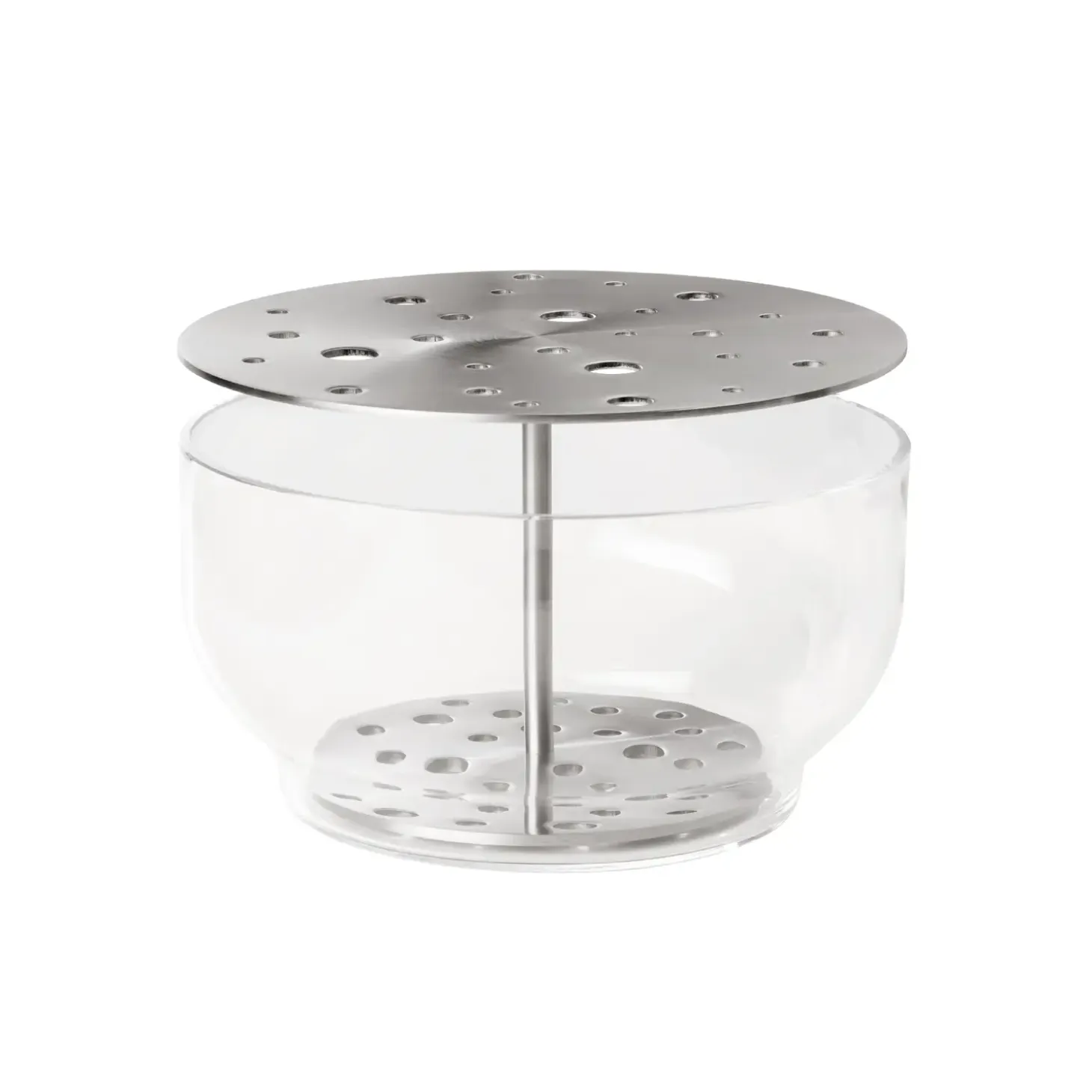 Denne vase fra Fritz Hansen kombinerer mundblæst klart glas med rustfrit stål i en funktionel konstruktion. Den centrale metalstang forbinder top og bund, hvilket sikrer en stabil struktur, der holder, selv når du arbejder med flere blomster.