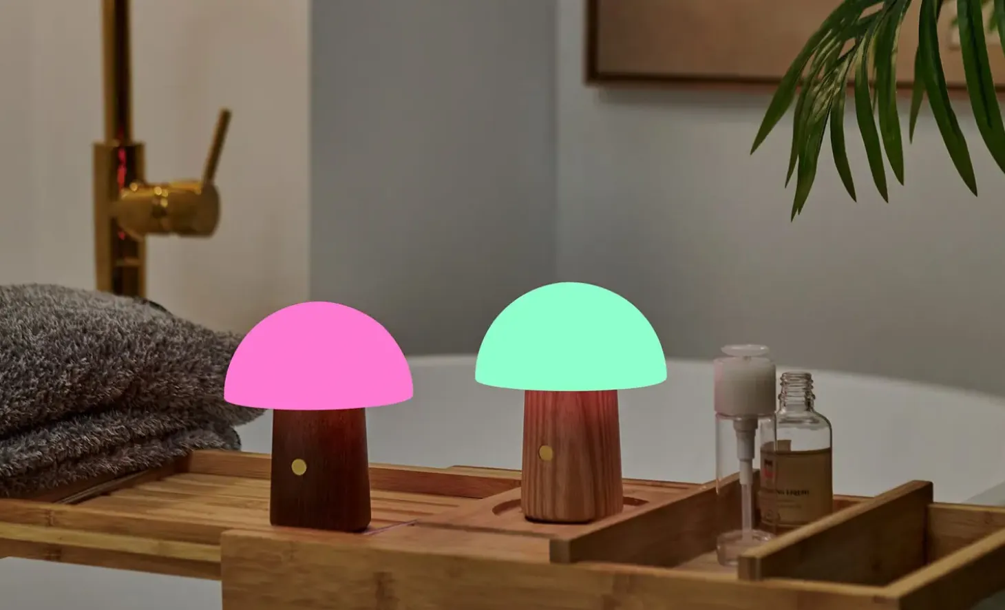 Valnød og hvid ask giver lampen et naturligt udtryk, der holder over tid. De to træsorter skaber en diskret kontrast i basen, mens den frostede ABS-skærm sikrer en jævn lysfordeling. Lampens svampeformede design gør den til et dekorativt element, selv når den er slukket. Den kompakte størrelse gør den nem at flytte rundt.