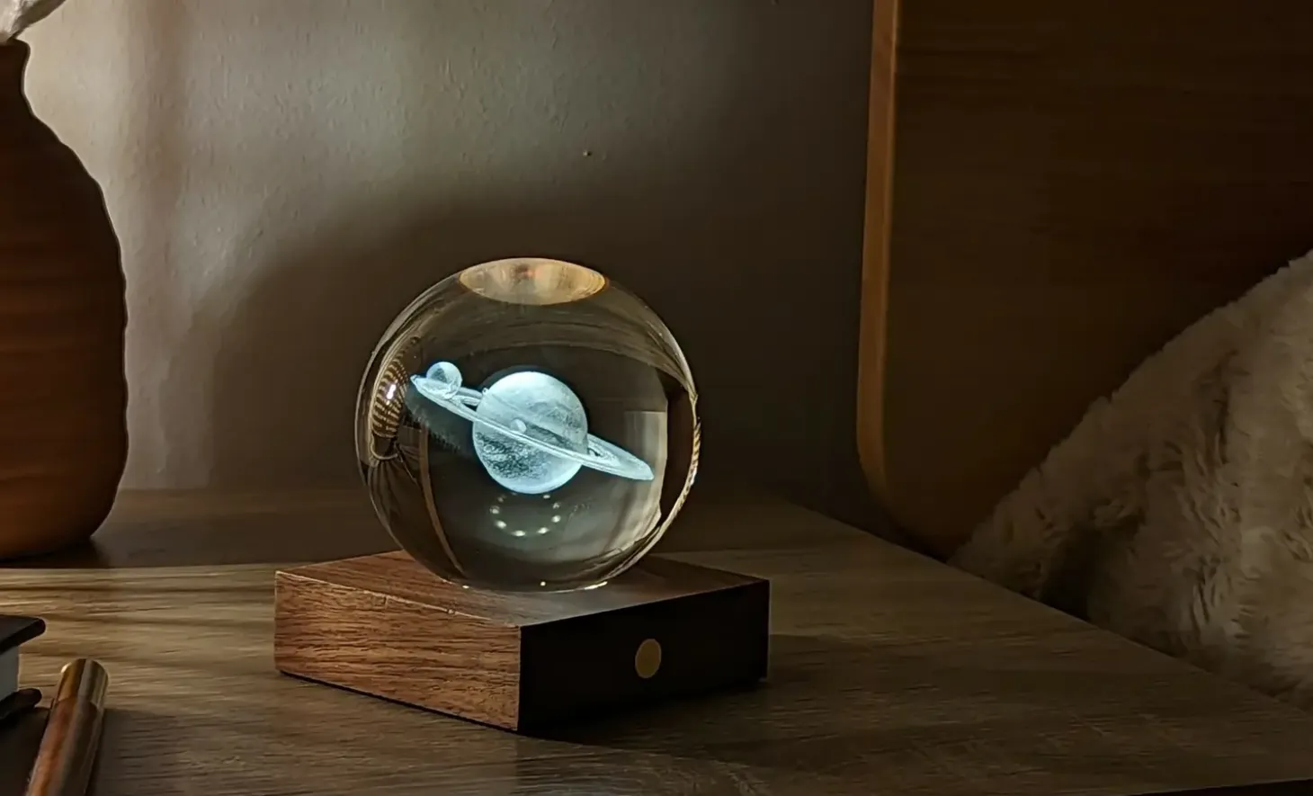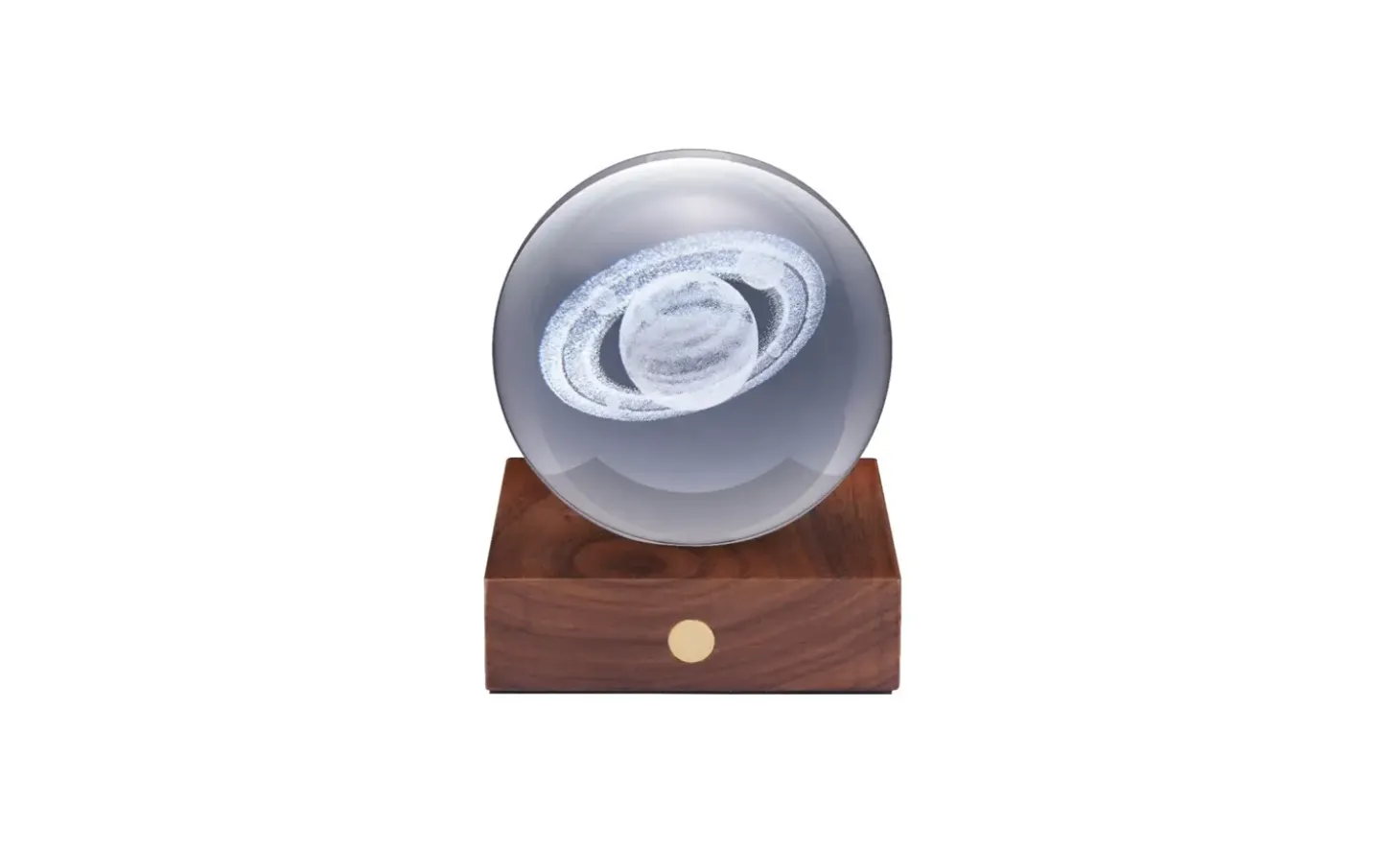 Denne skulpturelle lampe kombinerer håndværk med funktionel belysning. Krystalkuglen med Saturn-indgravering sidder på en base af massivt valnøddetræ og giver dit rum en organisk følelse. Det genopladelige batteri leverer op til 16 timers lys, så du kan bruge lampen hele dagen uden at tænke på opladning.