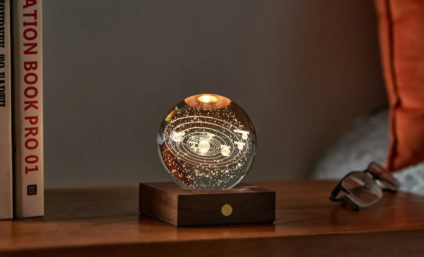 Denne krystallampe fremhæver solsystemets planeter og kredsløb gennem poleret glas. Valnøddetræsbunden rummer et genopladeligt batteri, der giver op til 16 timers lys på en enkelt opladning. Højden er 12 cm, hvilket gør den velegnet til bogreoler og natborde.