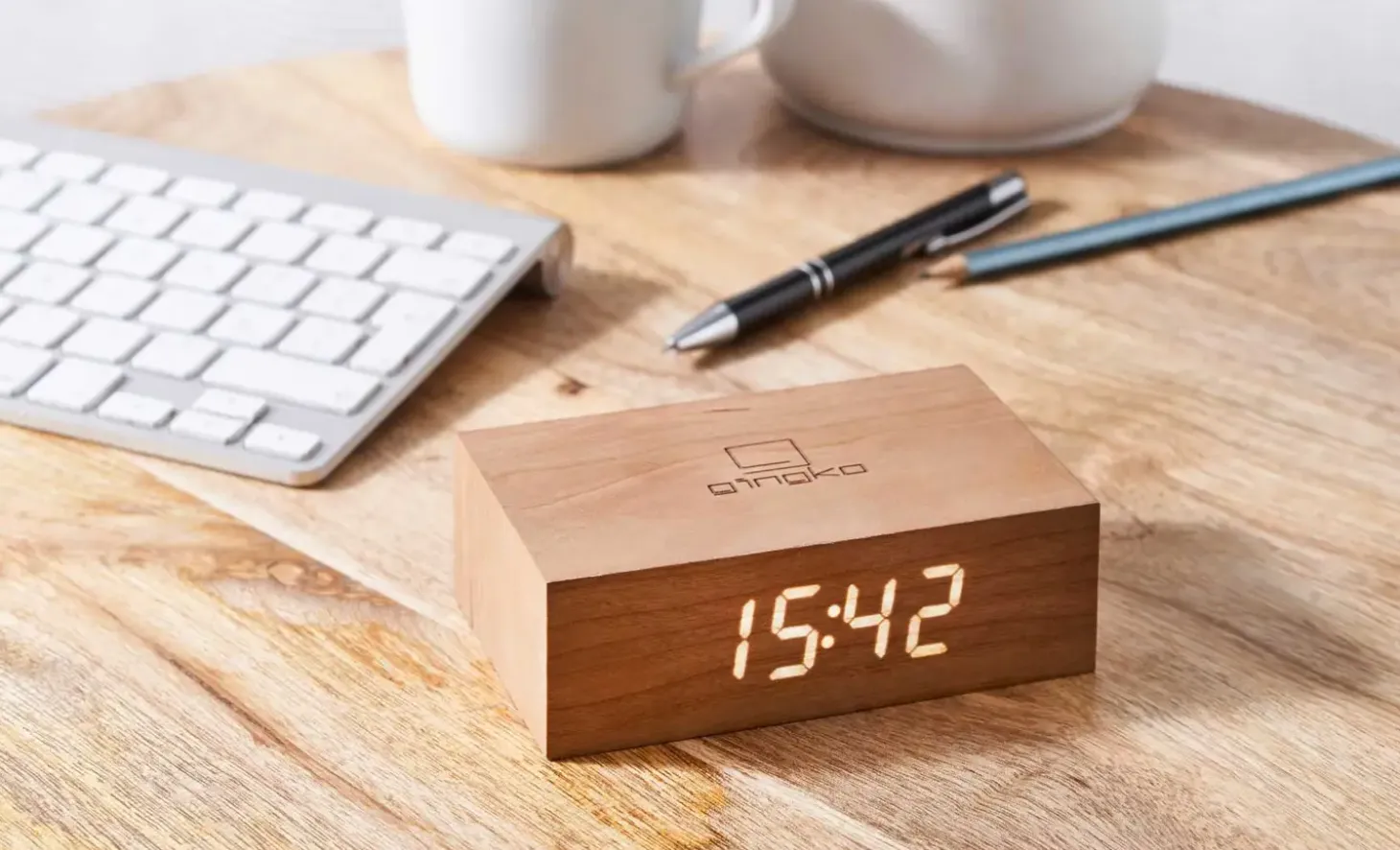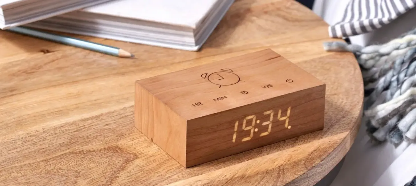 Dette vækkeur kombinerer naturlig kirsebærtræfinish med smart funktionalitet. Det måler 11,5 x 7 x 3,5 cm og passer på de fleste natborde. Det lydaktiverede ursystem slukker automatisk displayet i stilhed, hvilket reducerer unødvendig lysforurening om natten og sparer energi.