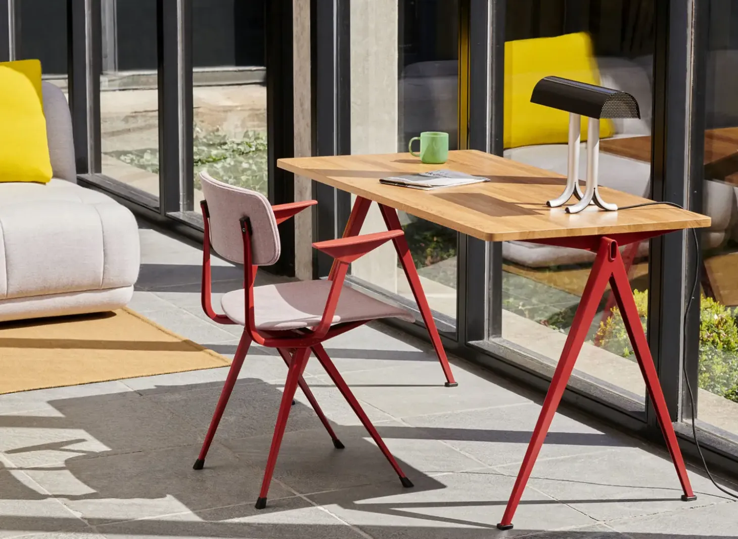 Den karakteristiske Anagram-bordlampe fra HAY kombinerer vådsprøjtet stål med en halvcirkelformet sort skærm. Med sine velgennemtænkte mål på B36,5 x D14 x H32,5 cm passer lampen til både arbejdsbordet og sidebordene.