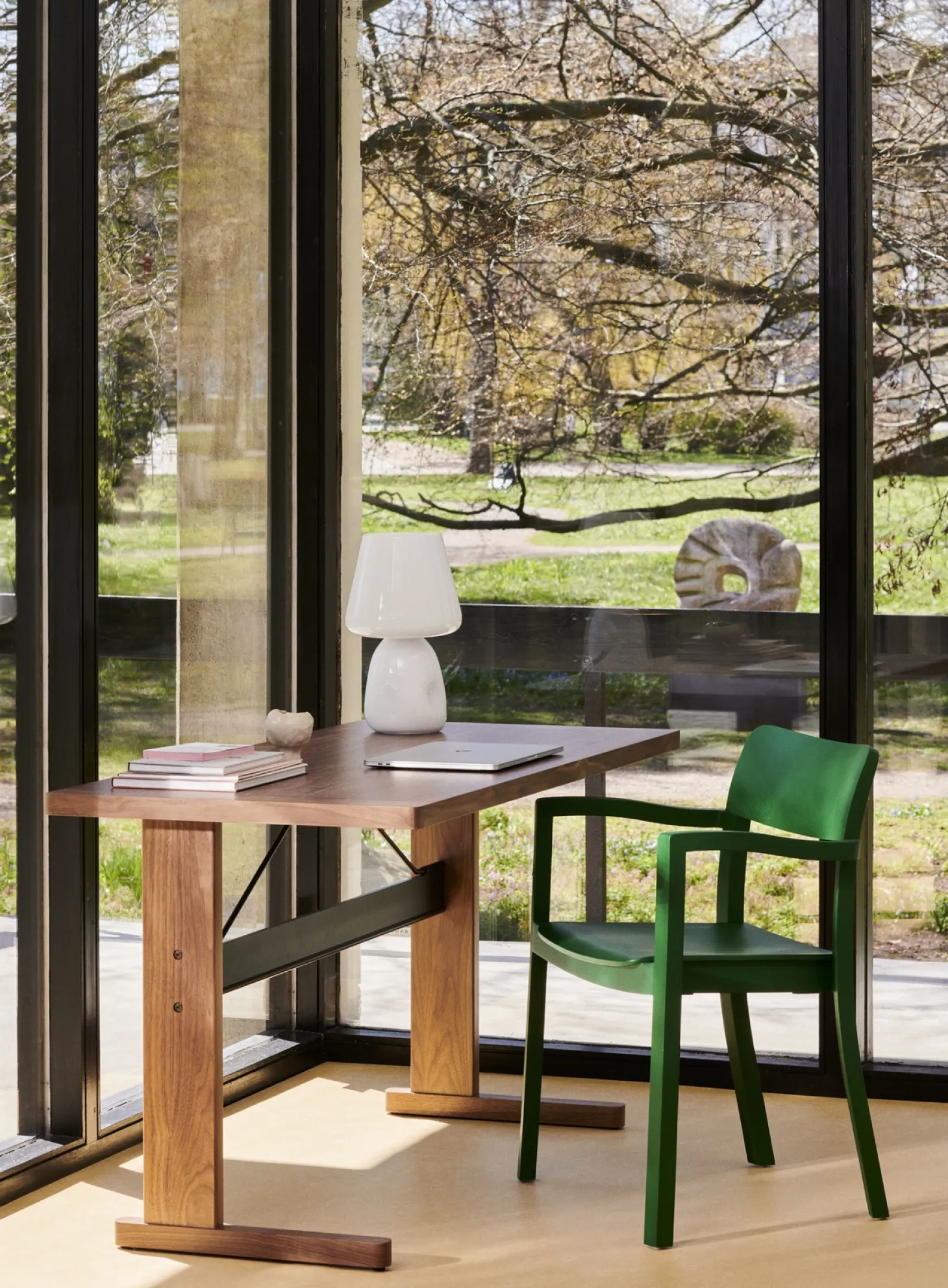 Apollo bordlampen fra HAY kombinerer opalglas med et afrundet design. Med en diameter på 25 cm og en højde på 38 cm passer den naturligt ind på skrivebordet eller som belysning på sideborde i stuen.