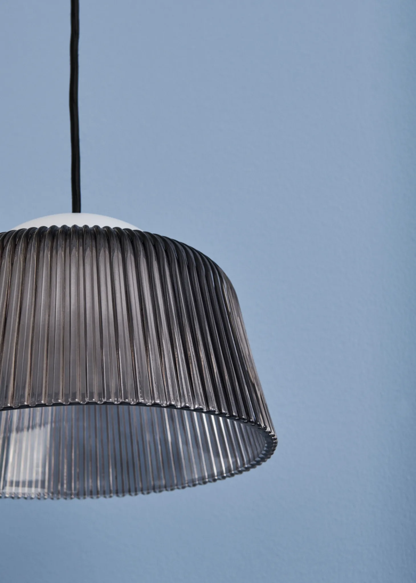 Denne pendel fra Hay har en stribet glasskærm i røgfarvet glas. Den indvendige kugle fordeler lyset i rummet. Pendlen måler 12,3 x 24,5 x 24,5 cm, hvilket gør den velegnet til forskellige rumstørrelser.