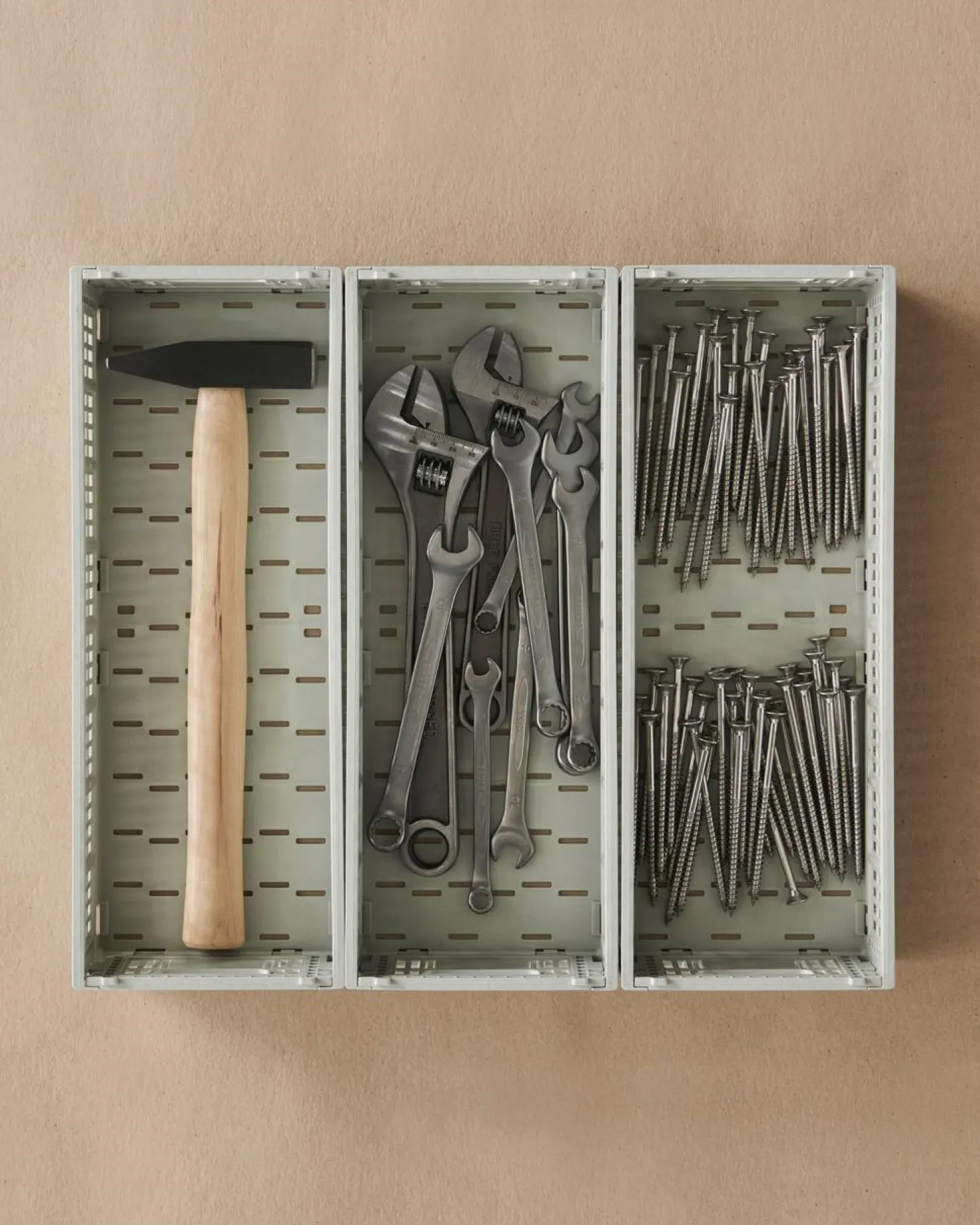 Denne kompakte opbevaringsløsning fra HAY kombinerer funktionalitet med miljøbevidst design. Den er fremstillet af 100% genanvendt PP-materiale, hvilket sikrer både holdbarhed og nem vedligeholdelse i hverdagen.