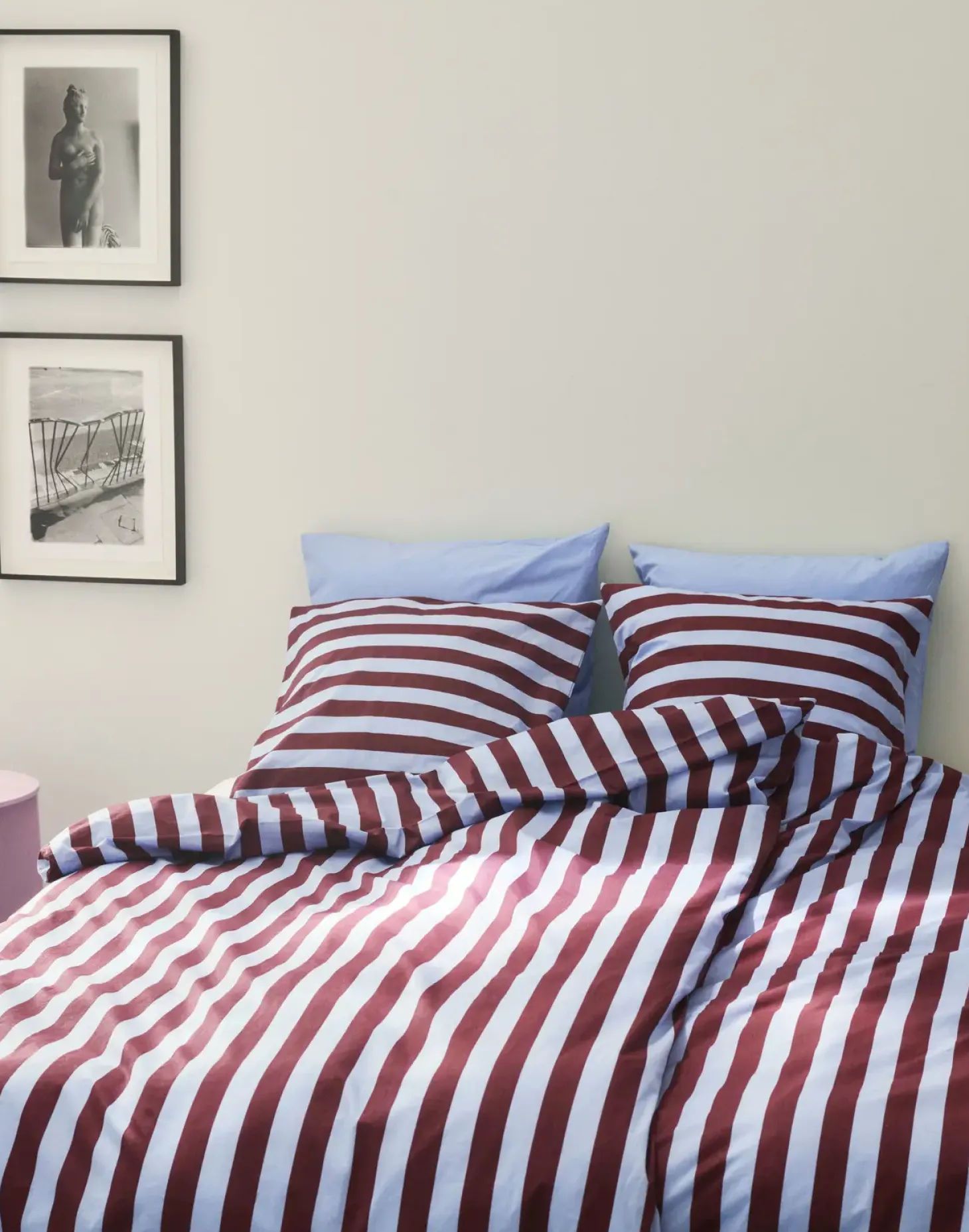 Dette dynebetræk i 100% bomuld fra HAY kombinerer blødhed med åndbarhed. De karakteristiske striber i bordeaux og himmelblå skaber et moderne udtryk, mens bomuldsmaterialet sikrer en behagelig nattesøvn.