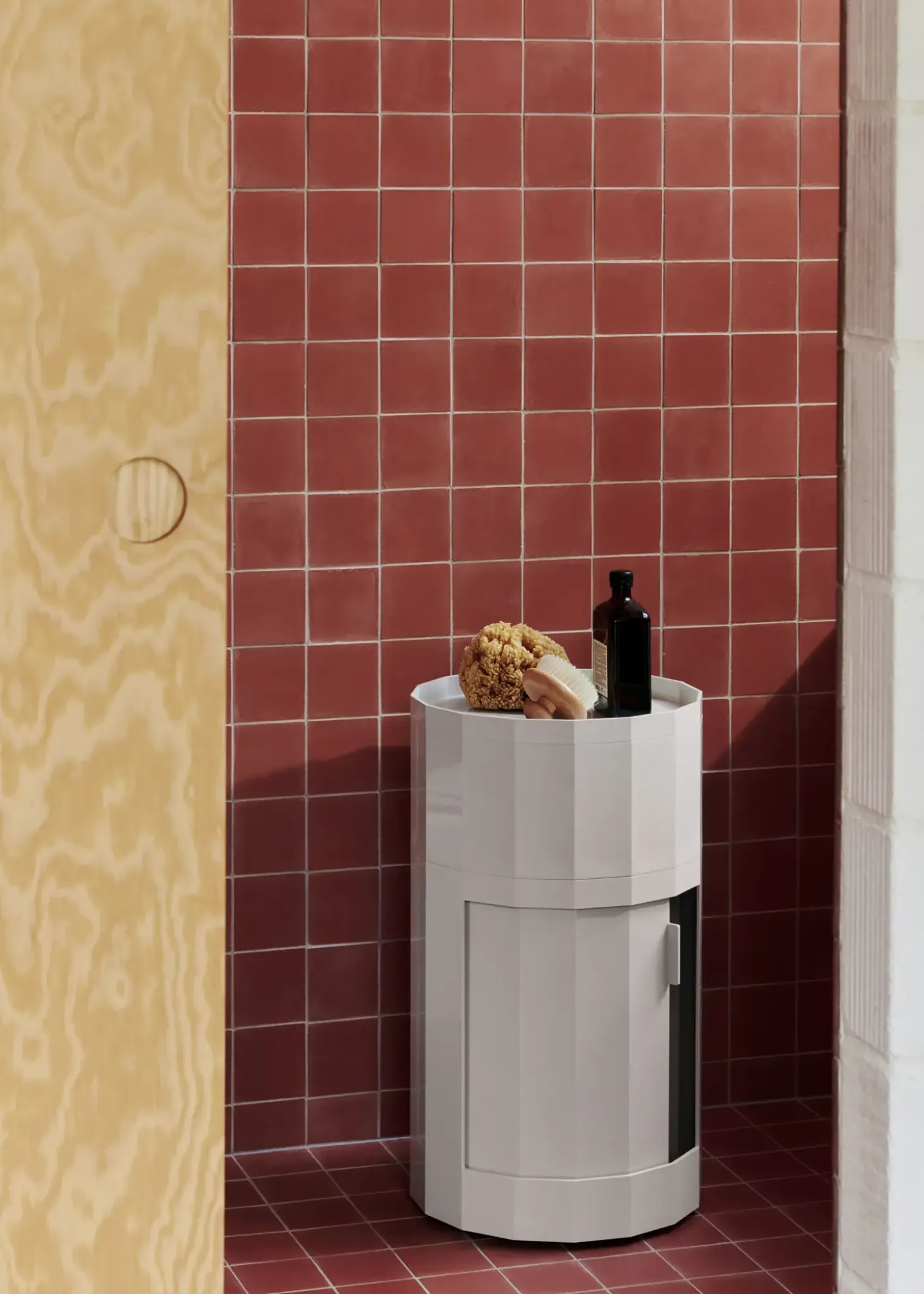 Dette kompakte skab kombinerer opbevaring med fleksibilitet. Med en svingbar dør og hjul kan du nemt flytte skabet efter behov, mens designet tilfører et moderne præg til rummet.