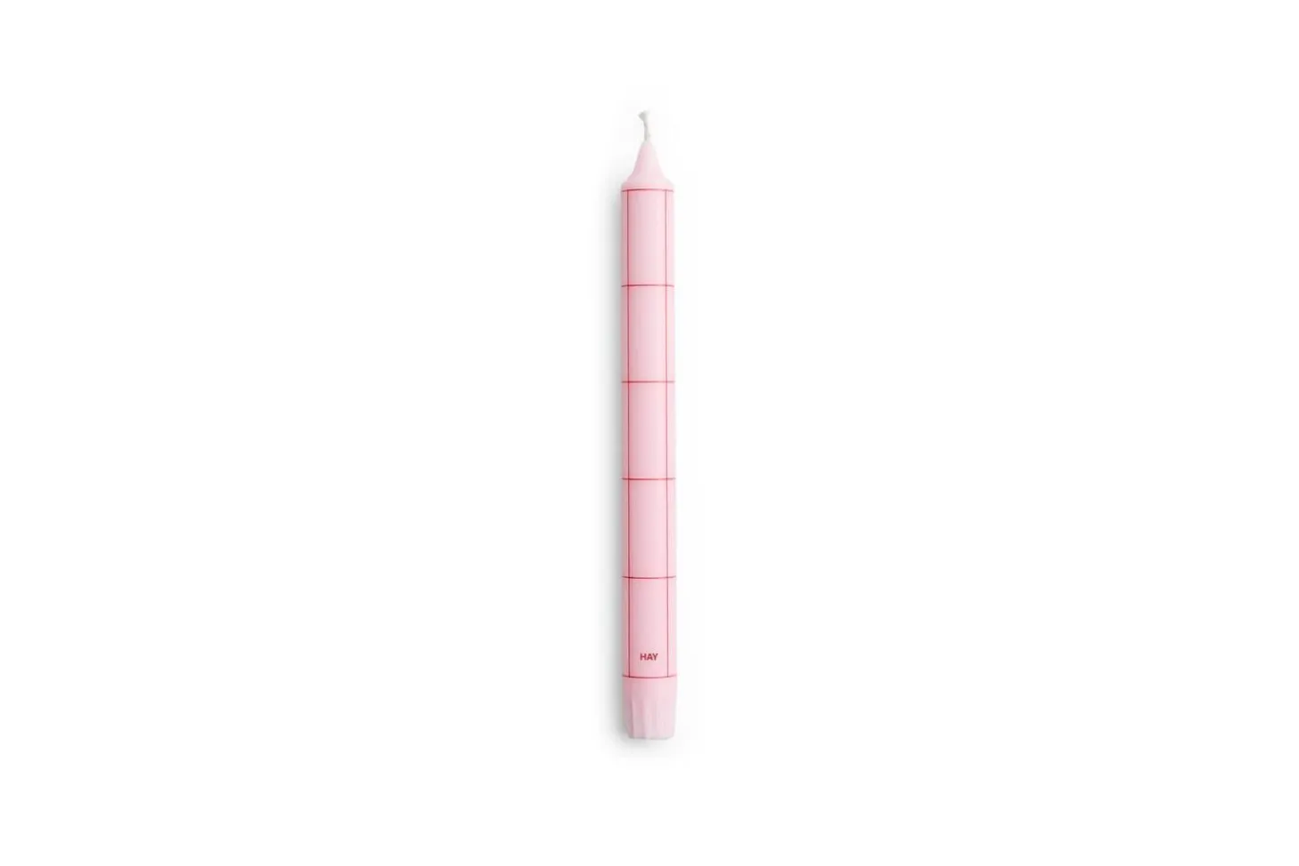 Dette cylinderformede stearinlys fra Hay kombinerer et delikat lyserødt ydre med et karakteristisk rødt gittermønster. Hay-brandet er diskret præget i bunden, hvilket sikrer autenticitet og kvalitet i dit hjem.