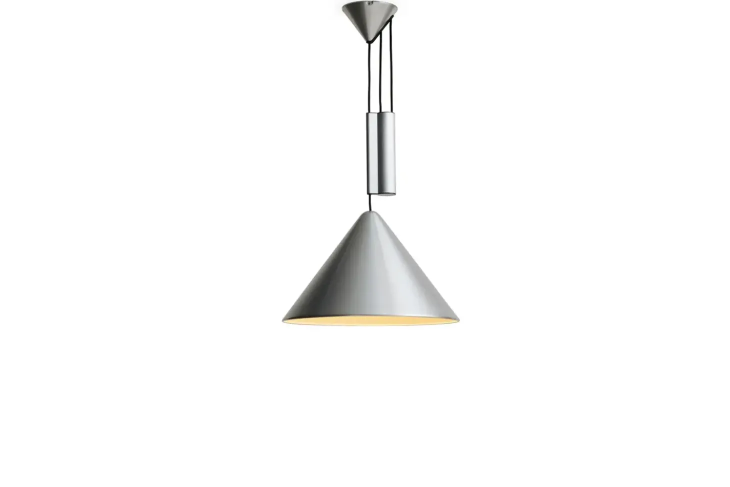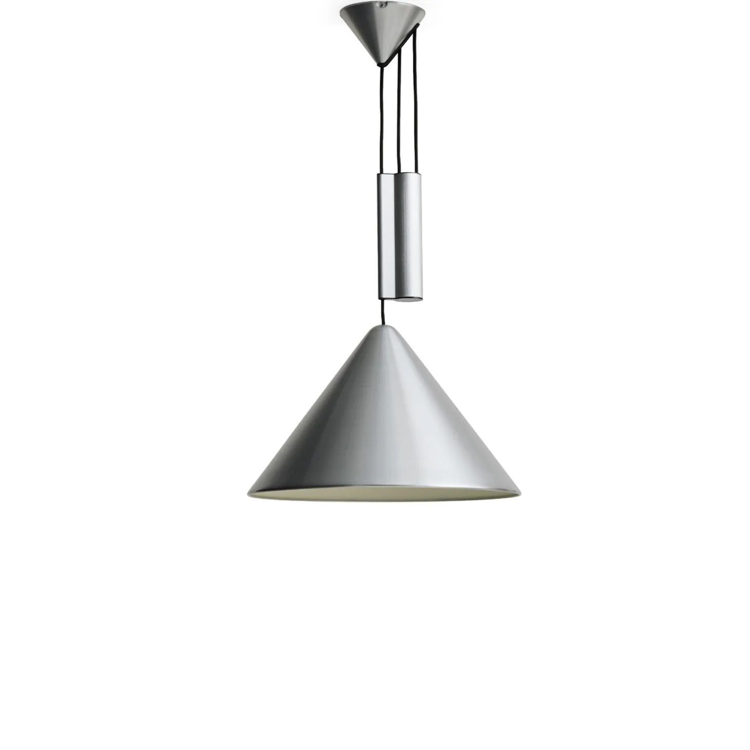Den kegleformede skærm spreder lyset effektivt i rummet, mens den børstede aluminiumsoverflade giver et roligt udtryk. Materialevalget betyder minimal vedligeholdelse og lang holdbarhed; aluminium er både let og korrosionsbestandigt.
