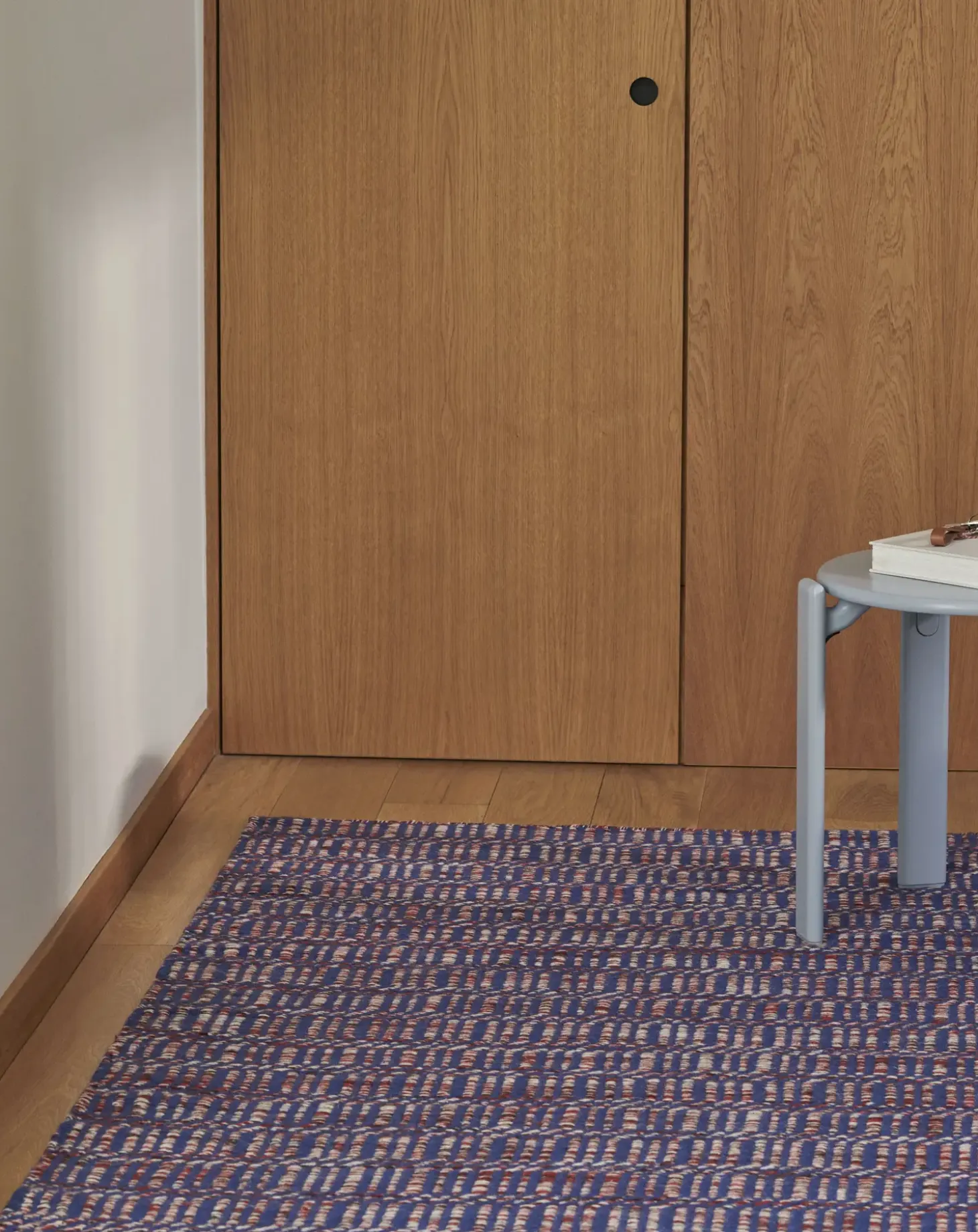 Det røde og blå herringbone-mønster skaber et karakteristisk udtryk. Tæppets håndvævede struktur giver dybde, og farverne gør det nemt at integrere i forskellige indretninger. Hvis du søger et holdbart og stilrent tæppe, er dette et godt valg.