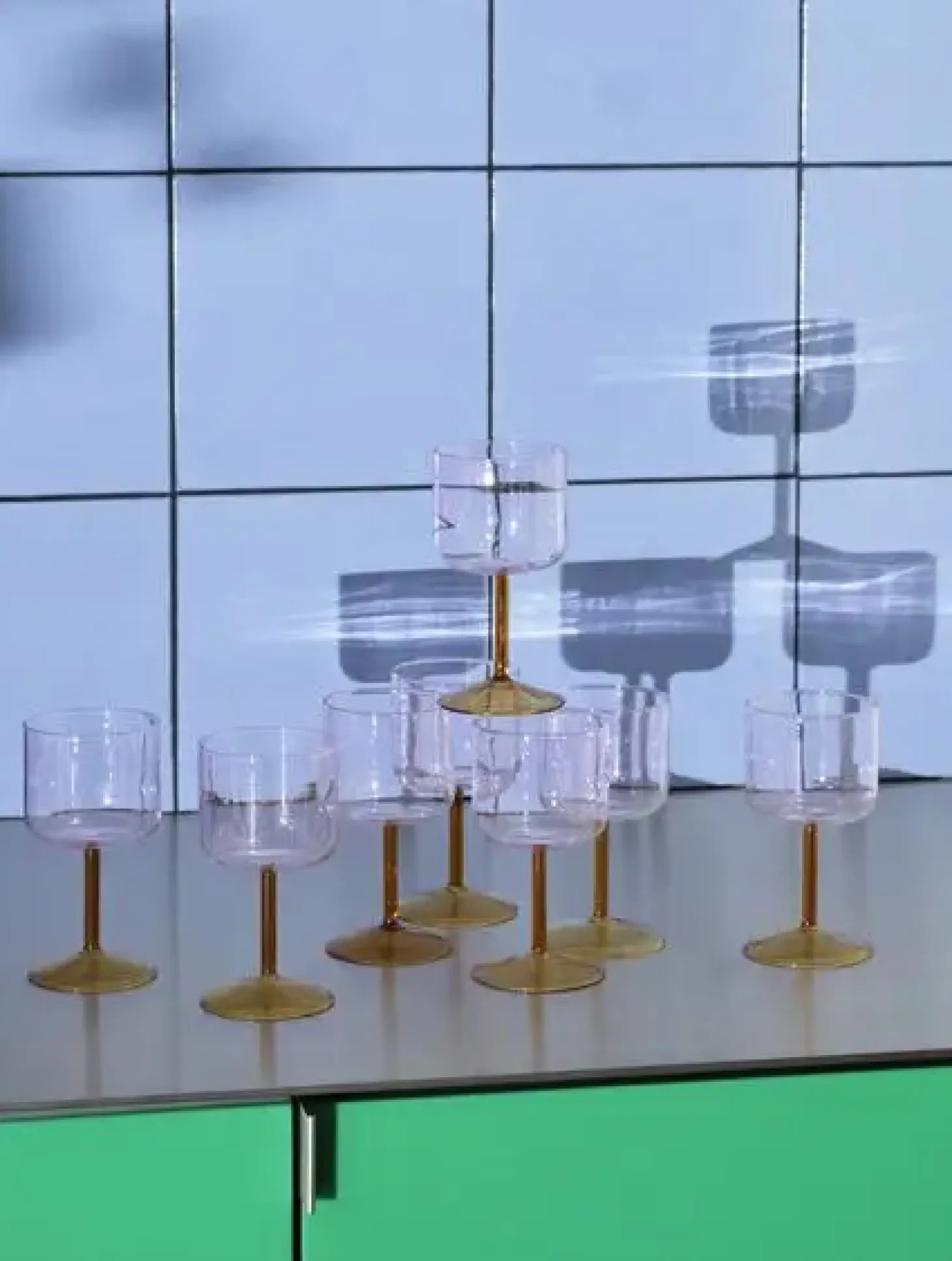 Den cylindriske form, kombineret med den grønne skål og den lyserøde stilk, skaber et unikt udtryk. Du får både et praktisk vinglas og et designelement, der kan bruges til både hverdag og fest. Borosilikatglasset sikrer god holdbarhed.