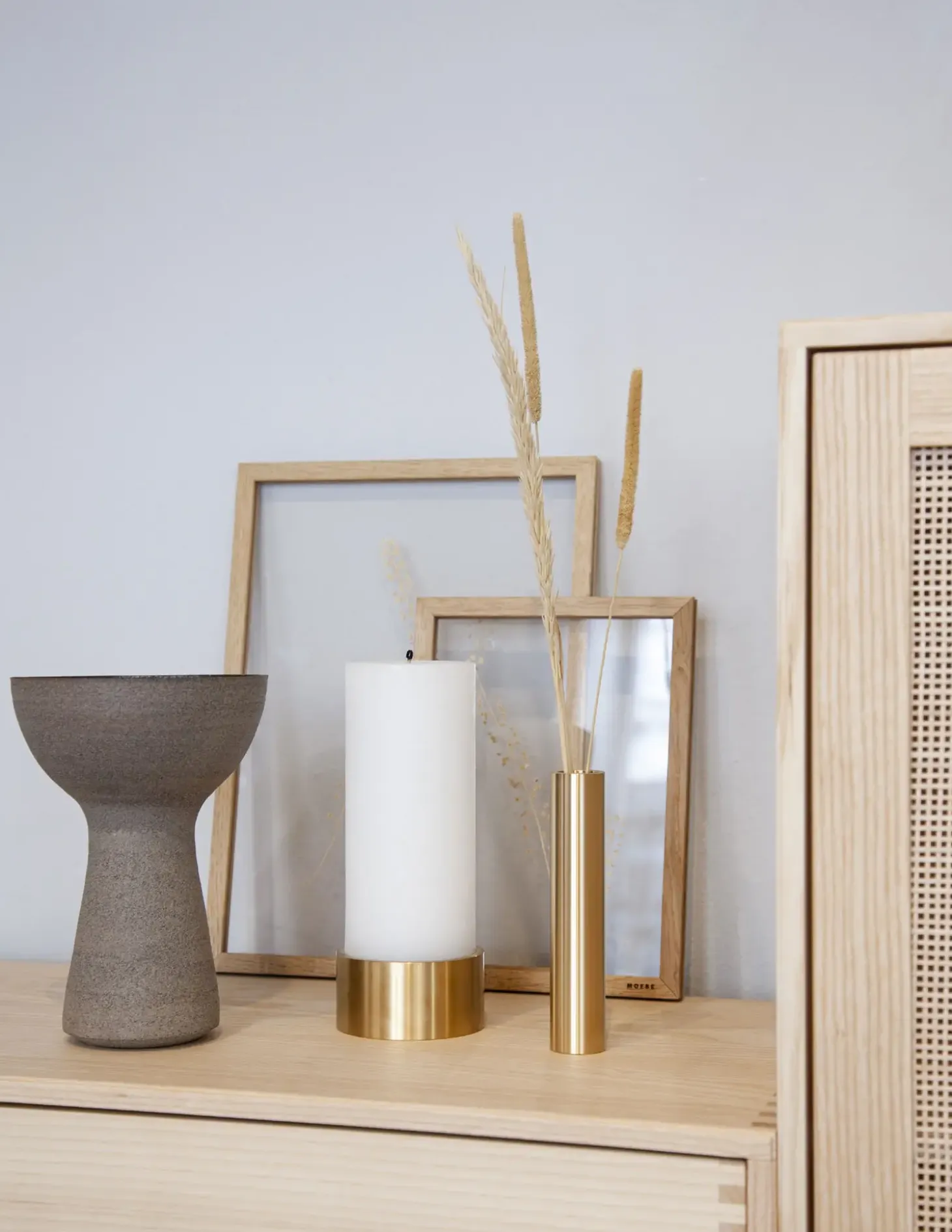 Denne lysestage fra Kunstindustrien er fremstillet af massiv messing, hvilket giver både holdbarhed og en skinnende, metallisk finish. Materialet sikrer, at lysestagen kan bruges år efter år uden at miste sin karakter. Den cylindriske form og det metalliske udseende passer ind i både moderne og klassiske boligindretninger.