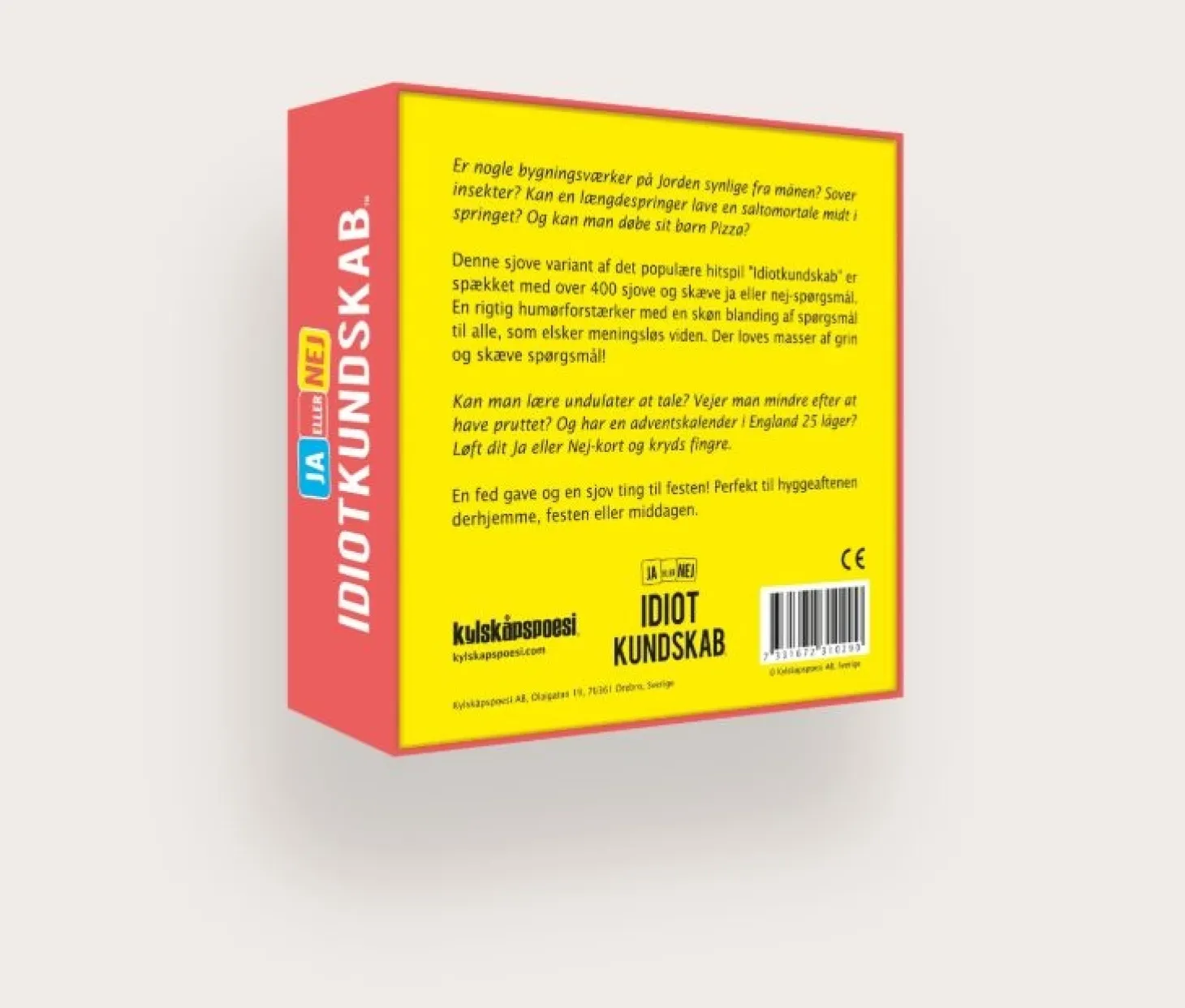 Denne sjove variant af det populære hitspil ”Idiotkundskab” er spækket med over 400 sjove og skæve ja eller nej-spørgsmål. En rigtig humørforstærker med en skøn blanding af spørgsmål til alle, som elsker meningsløs viden. Der loves masser af grin og skæve spørgsmål!