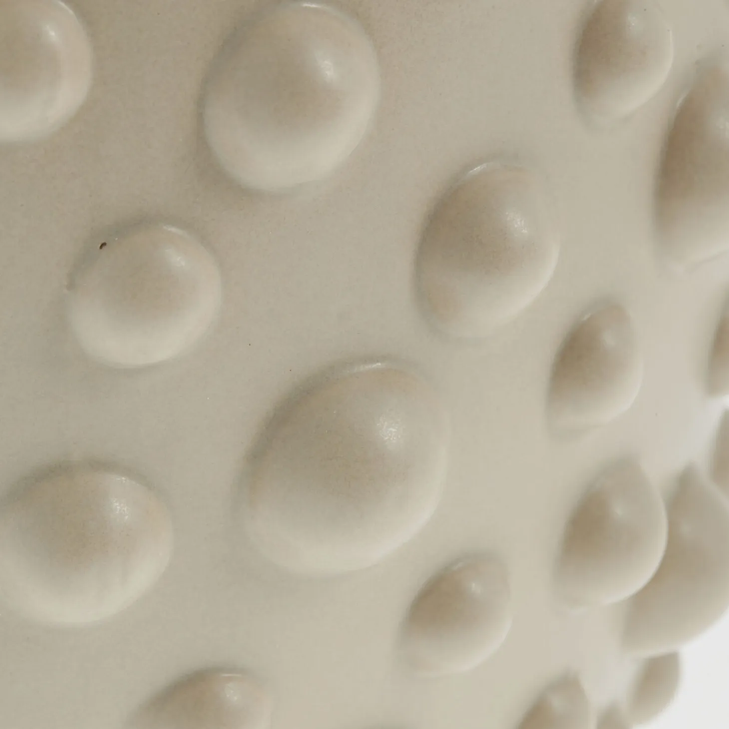Doelle-skjuleren har en overflade med hævede, prikkede mønstre, der tilfører dybde og karakter. Den neutrale sandfarve giver et diskret udtryk, mens dens runde form og åbning gør den praktisk til både planter og dekorative formål.