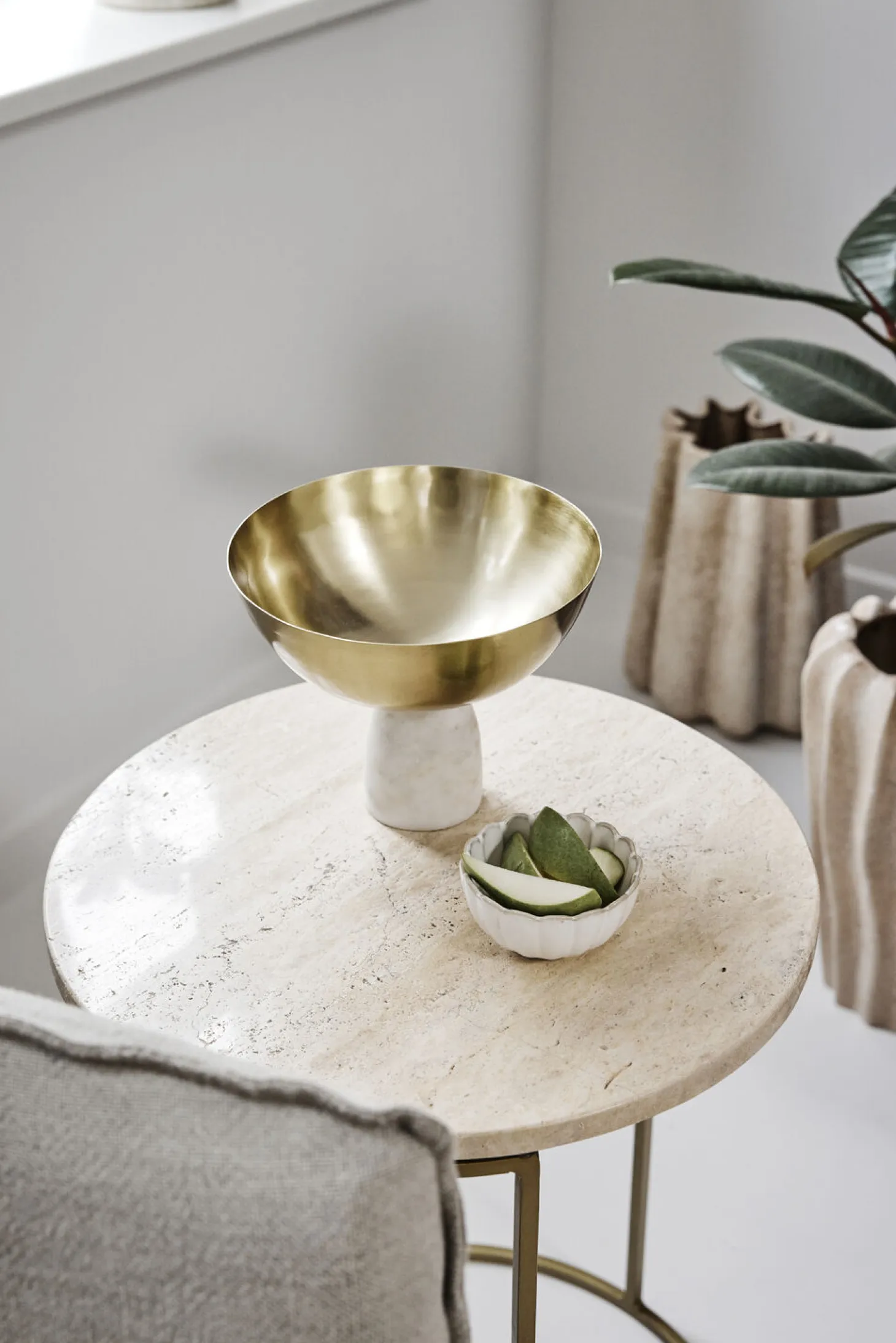 Marmorbasen giver et solidt fundament, mens skålen er designet med en iøjnefaldende rund form, der tiltrækker øjet. Skålen er perfekt til at udstille nipsgenstande og småting i, eller bare til at vise sin egen skønhed frem. Tilføj et strejf af elegance til dit hjem med denne stilfulde Ellivia dekorationsskål.