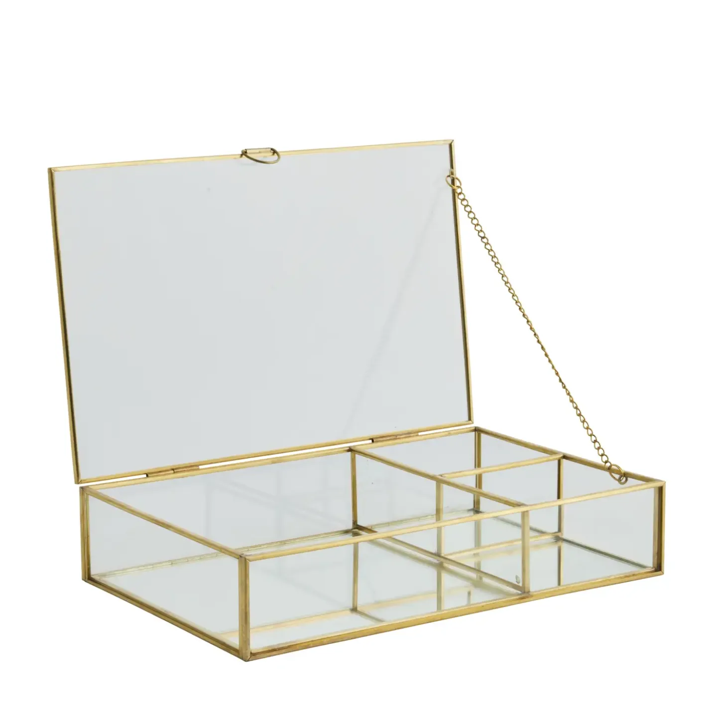 Denne opbevaringsboks er håndlavet af glas og metal. Dens smukke guldfinish er både tidløst og elegant. Det gennemsigtige glas giver et klart udsyn til dine værdsatte smykker, der er pænt organiseret og beskyttet indeni.
