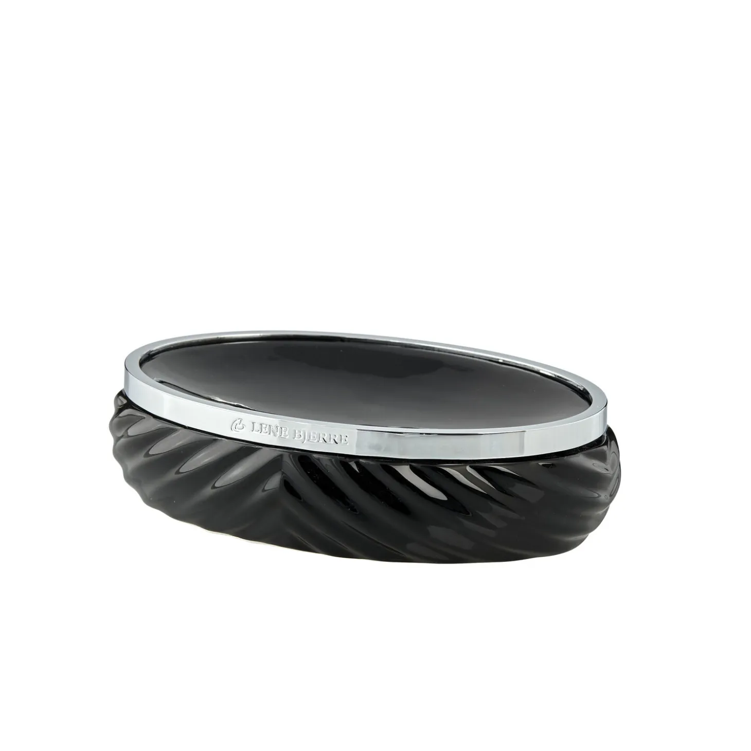 Milda sæbeholder i keramik i sort med en sølv kant fremstillet af zink legering.