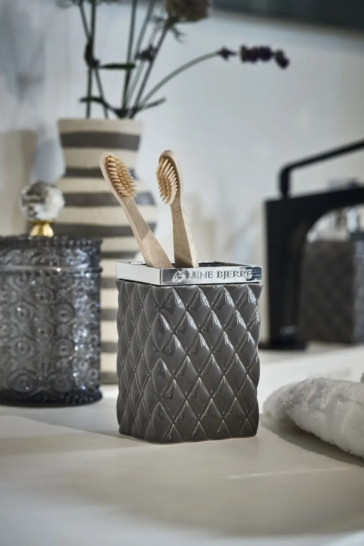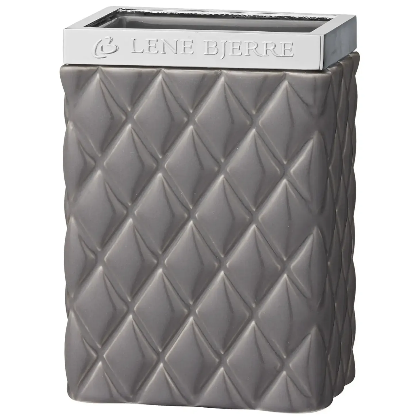 Harlekin mønstret grå keramik tandkrus med sølv top. Dette Portia tandkrus måler L8xB6xH11 cm. og er perfekt til opbevaring på badeværelset, hvor det vil være både praktisk og dekorativ på én og samme tid. Brug det til tandbørster eller måske til make-up pensler, hårbørster eller noget helt tredje. Hos Lene Bjerre har vi skabt et bredt sortiment af flotte tandkrus, hvor funktionalitet og design er i fokus. Du kan vælge imellem forskellige materialer, farver og designs og dermed nemt og enkelt bringe et nyt udtryk på dit badeværelse.
