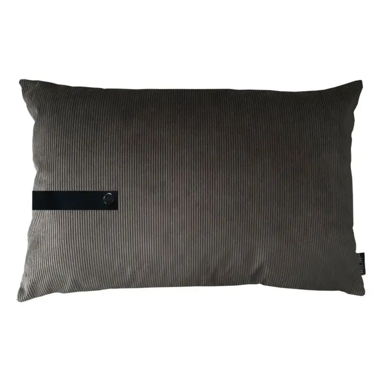 Super flot pude, syet i dejligt blødt curduroy af fineste kvalitet, som giver et simpelt og lækkert udtryk, som gør, at den kan styles på mange måder og passer ind i hjem med forskellige indretningsstile. Puden er påført en læderrem i sort kernelæder. Læderremmen går igen i Louise Smærups tekstildesigns, og skaber en diskret, men unik signatur for hendes forskellige designs.
