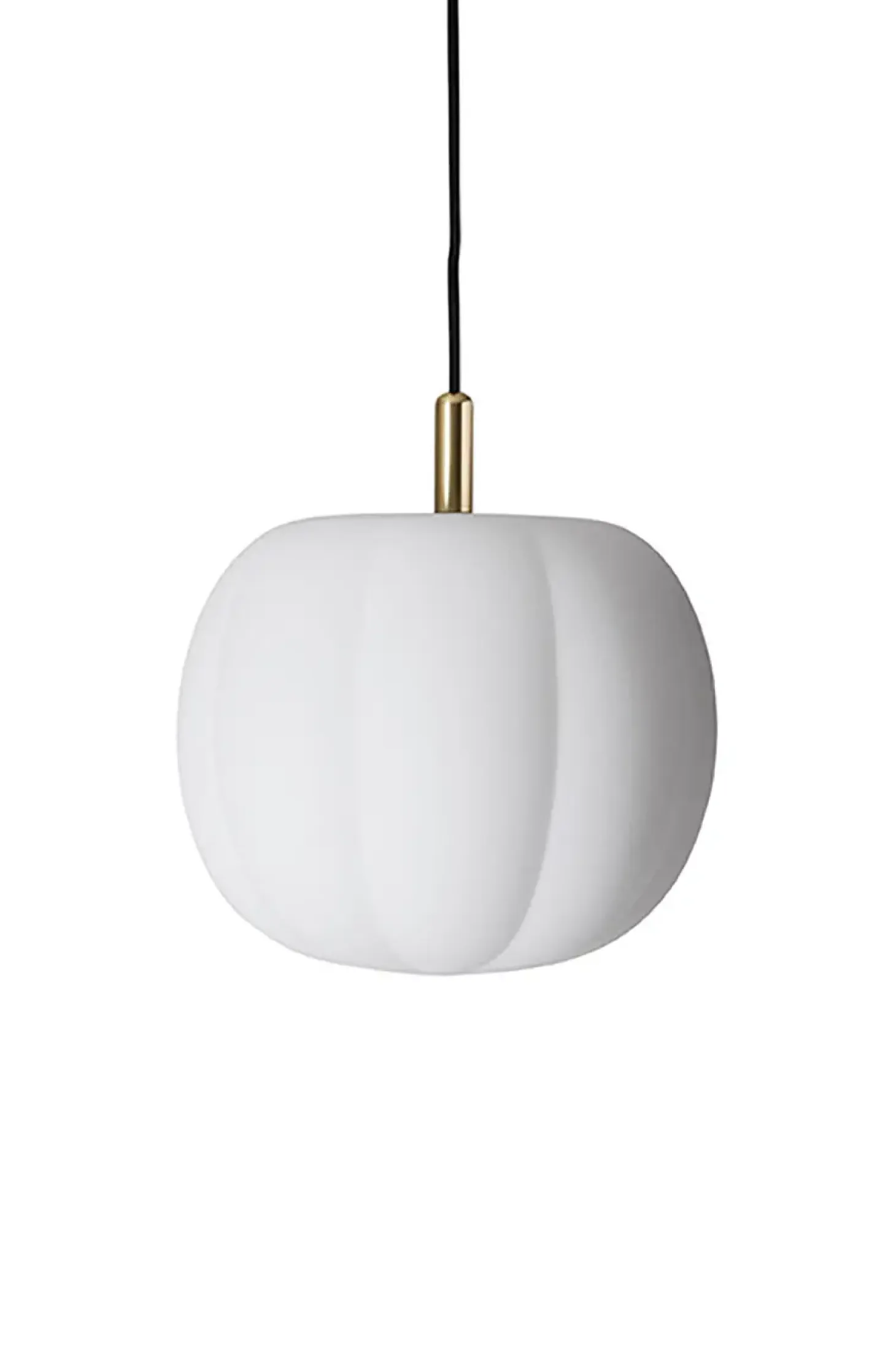 Denne mundblæste glaslampe har en græskar-inspireret form. Opalglas og messingtop kombineres for at sprede lys i rummet. Lampens organiske silhuet tilføjer et særligt element til dit hjem.