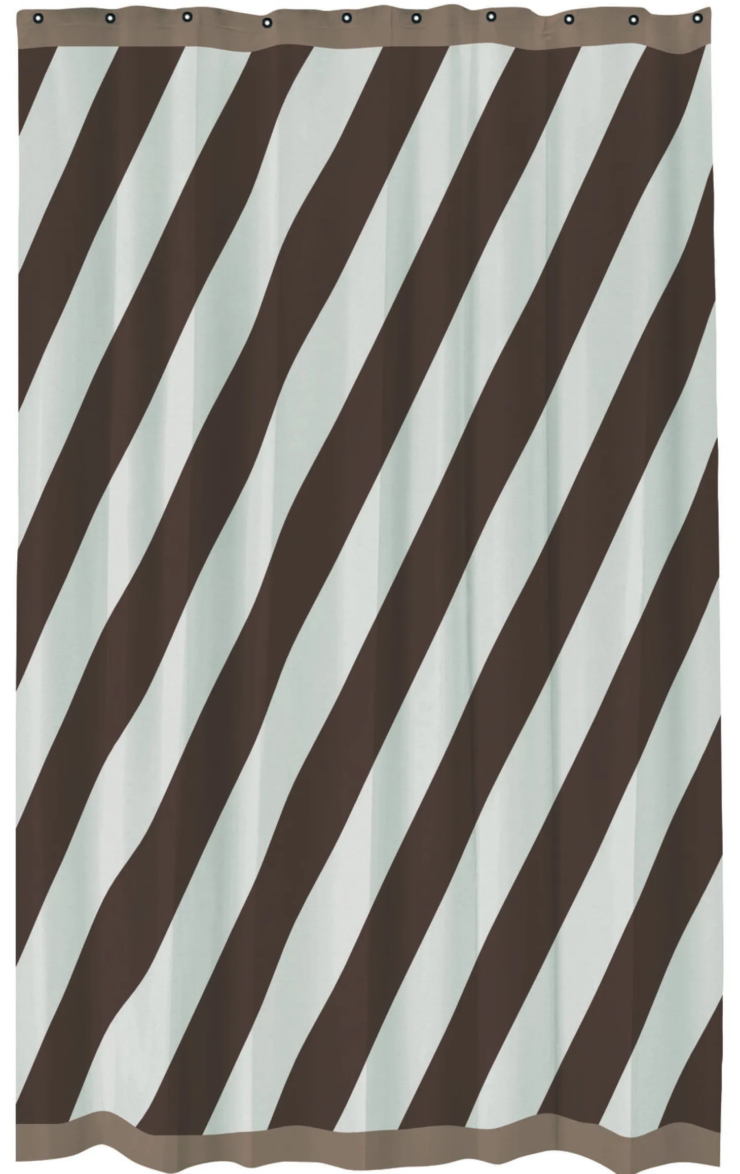 Opgrader badeværelset med DIAGONAL-badeforhænget, der kombinerer tidløs elegance med praktisk funktionalitet. Dette stilfulde forhæng er designet med brede diagonale striber i varme brun- og off-white nuancer, afsluttet med en elegant lysebrun bort udstyret med sorte metalringe for nem ophængning.